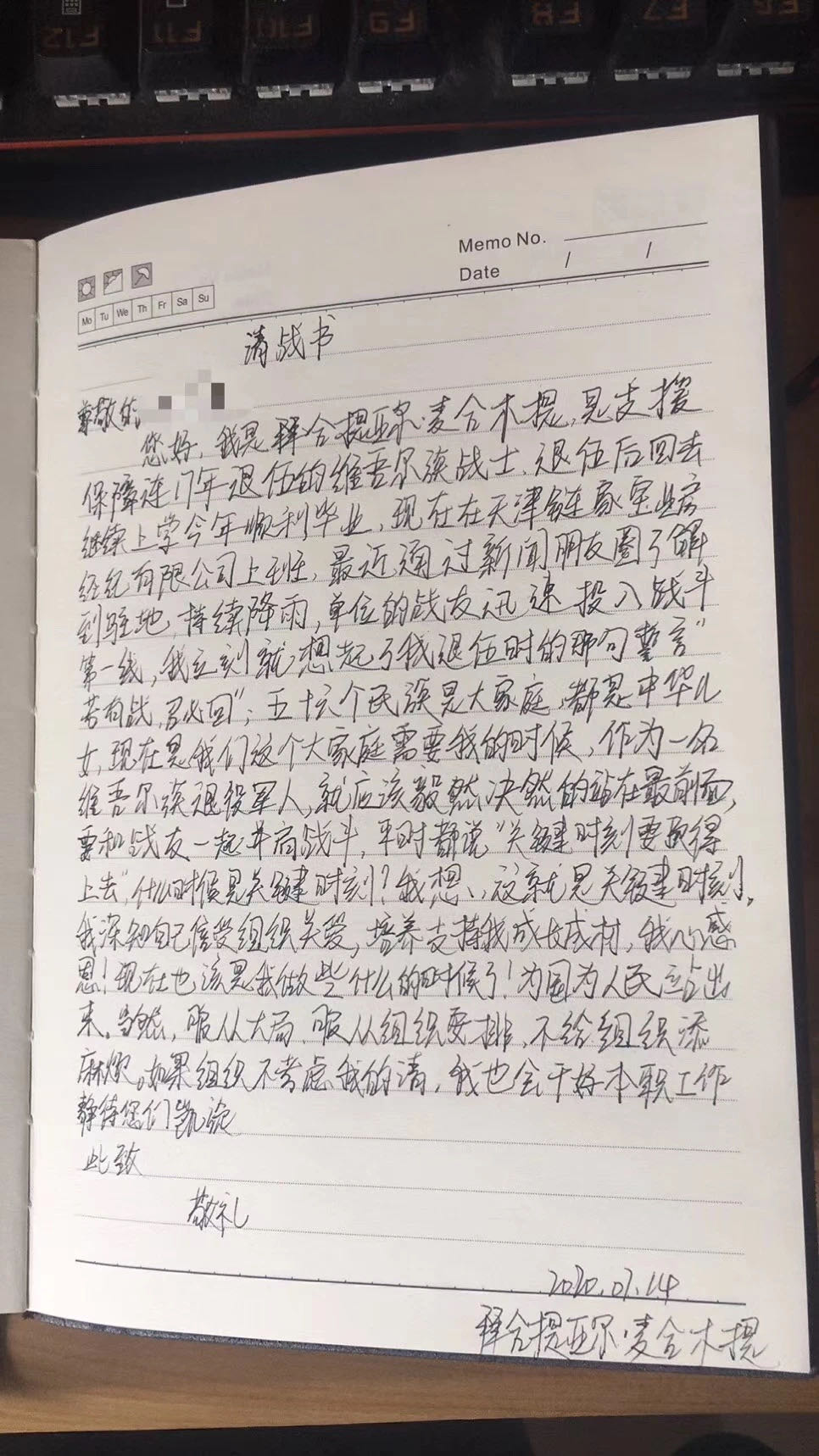拜合提亚尔写下的请战书(央广网发 拜合提亚尔供图)