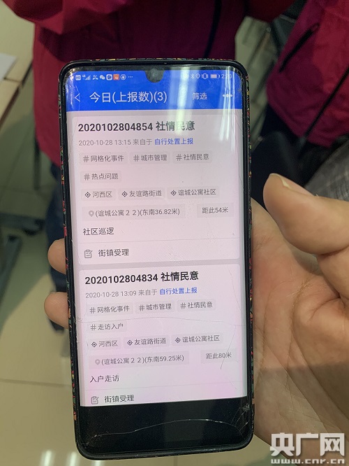 网格员向记者展示使用APP上报社区情况(央广网记者苏平 摄)