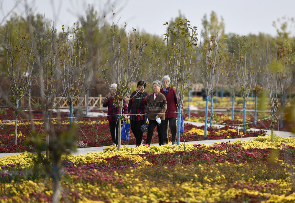 游人在天津市北辰区双街村的百亩菊园内漫步(10月27日摄)。新华社记者 李然 摄