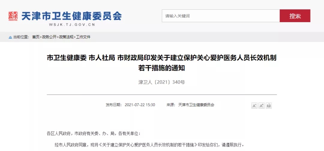 7月22日,天津市卫健委网站发布了天津市卫生健康委、天津市人社局、天津市财政局《关于建立保护关心爱护医务人员长效机制若干措施》的通知。