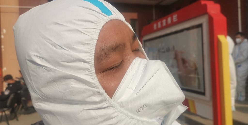 “觉得时间真是太不够用了,连睡觉都舍不得,一分钟恨不能掰成八瓣用,要协调的、要做的事情太多了!”社区防控工作总指挥张宝明声音嘶哑地说。这个一米八几的魁梧汉子,由于需要不停地协调、劝解、喊话,来到封控区的第二天,嗓子就哑了,由于睡眠不足他的眼里布满血丝。这位40多岁的退伍军人,这次投入的是一场没有退路的硬战。