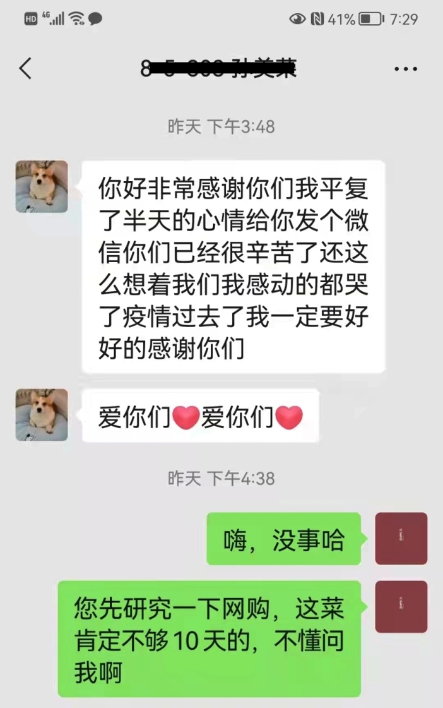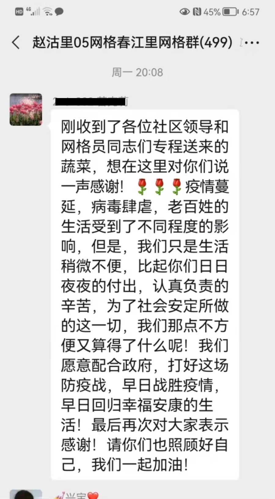 微信群里,每天都能看到感谢的留言:“刚收到了送来的蔬菜,对你们说一声感谢。疫情蔓延,病毒肆虐,老百姓的生活受到了不同程度的影响,但是我们只是生活稍微不便,比起你们日日夜夜的付出,认真负责地辛苦,为了全社会安定所做的这一切,我们那点儿不方便又算得了什么呢?我们愿意配合政府打好这场防疫战。请你们也照顾好自己,我们一起加油。”