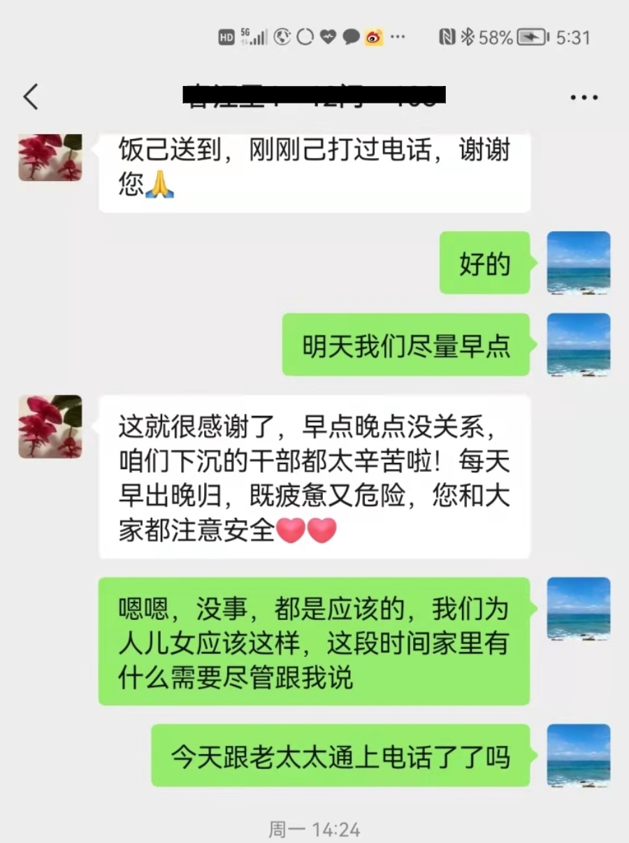 “饭送得早点儿晚点儿都没关系,咱们下沉的干部都太辛苦了!每天早出晚归,既疲惫又危险,您和大家都注意安全。”
