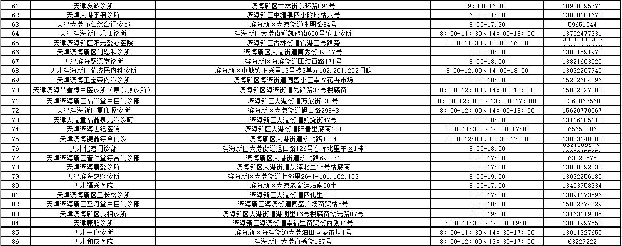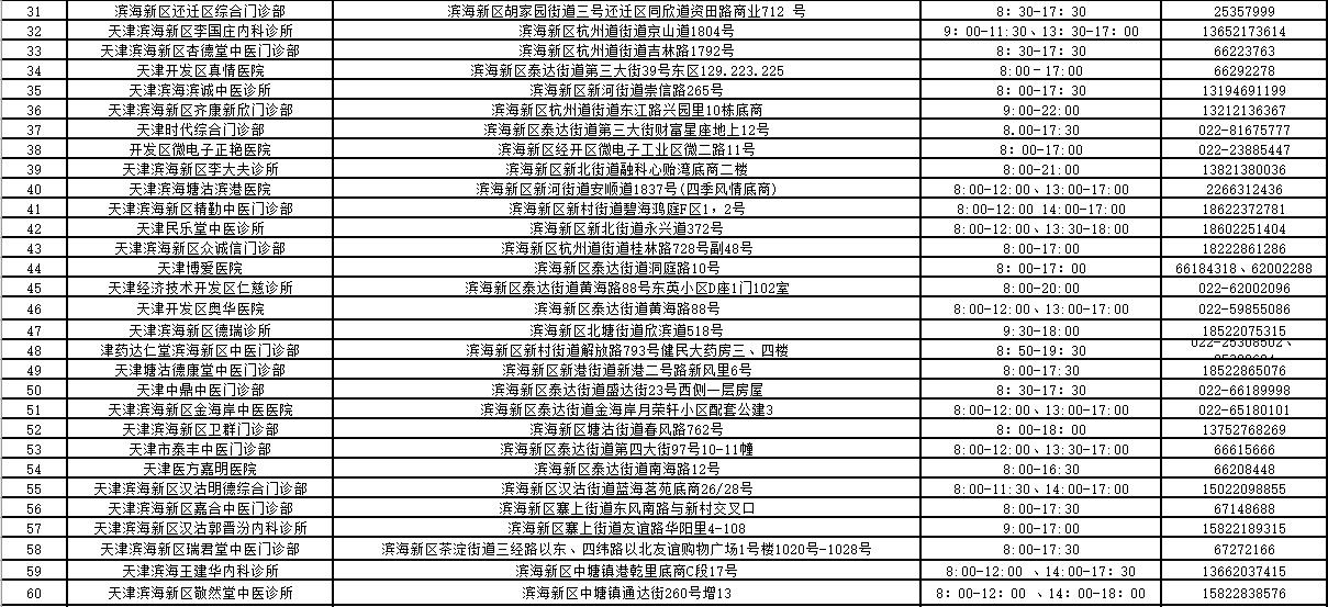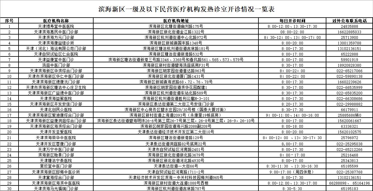为了更好地满足广大居民的就医需求,滨海新区一级及以下民营医疗机构发热诊室现已开诊。如果有出现发热等症状的居民,建议就近就诊,减少到人员密集的发热门诊就医,避免造成交叉感染。现将滨海新区一级及以下民营医疗机构发热诊室设置情况进行公示,供广大居民就医参考使用。