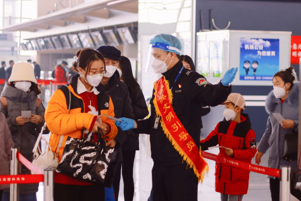 工作人员在天津滨海国际机场引导旅客。(受访者供图)