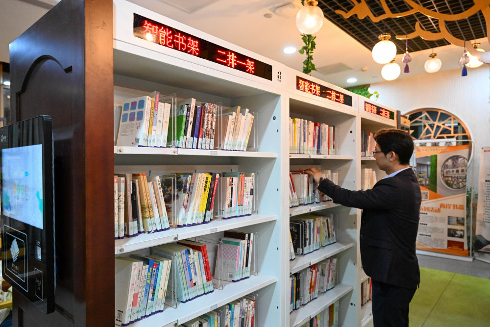 ↑ 在天津市河西区新梅江文体中心西岸书斋,工作人员将图书放置在智能书架上方便读者快速检索(4月19日摄)。