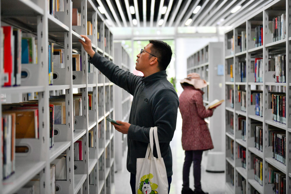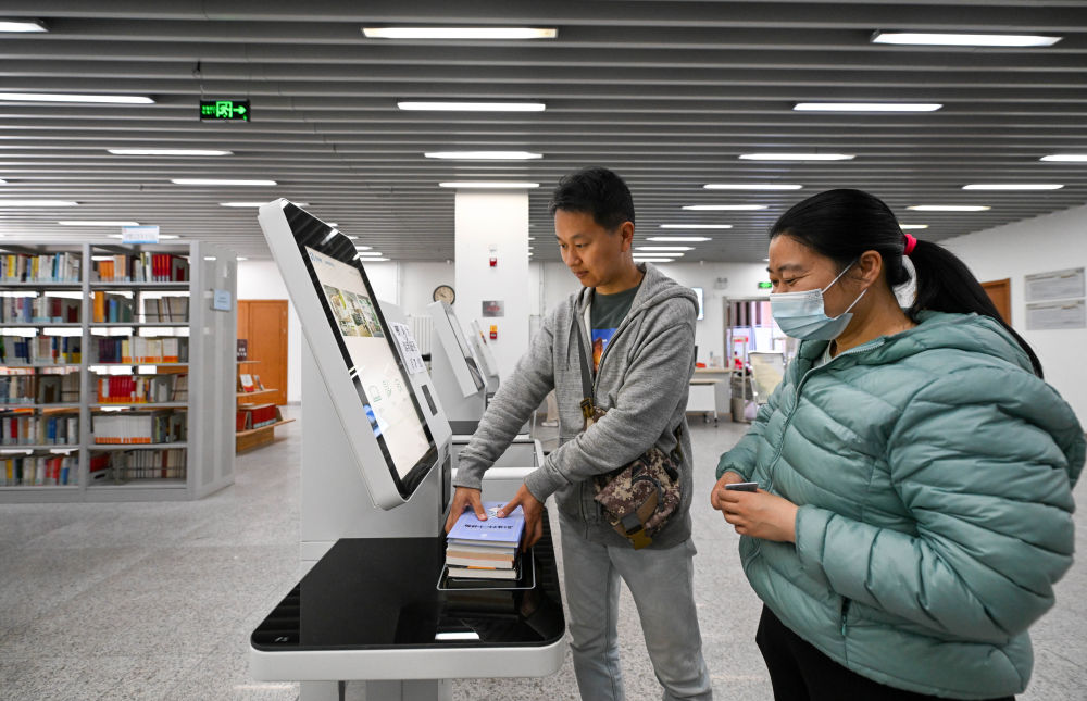 ↑ 4月21日,在天津市河西区文化中心,读者在区文化中心图书馆进行图书通借通还。