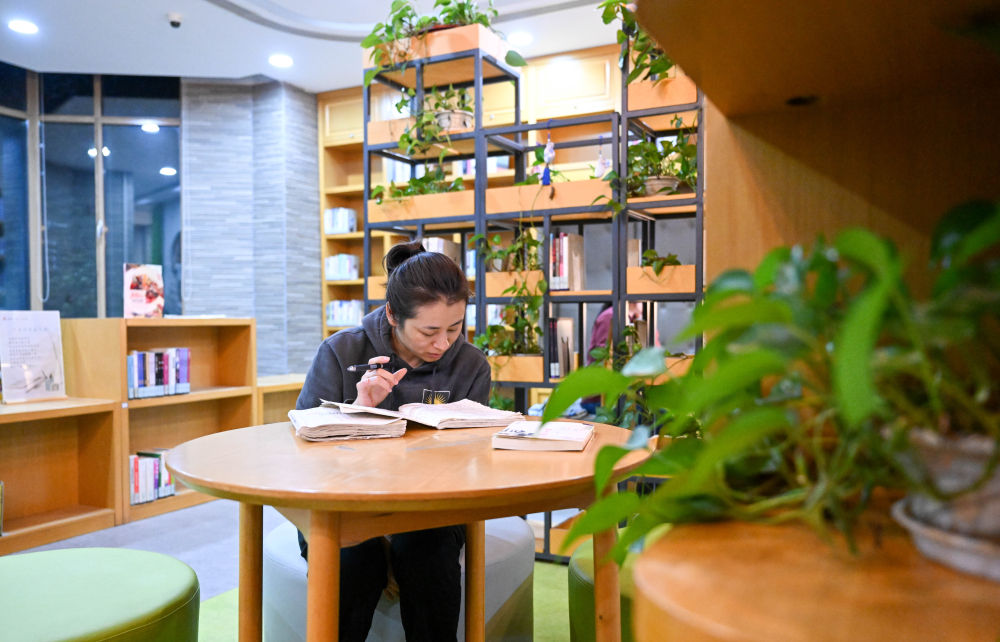 ↑ 在天津市河西区新梅江文体中心西岸书斋,读者在阅览室内进行夜间延时阅读(4月19日摄)。