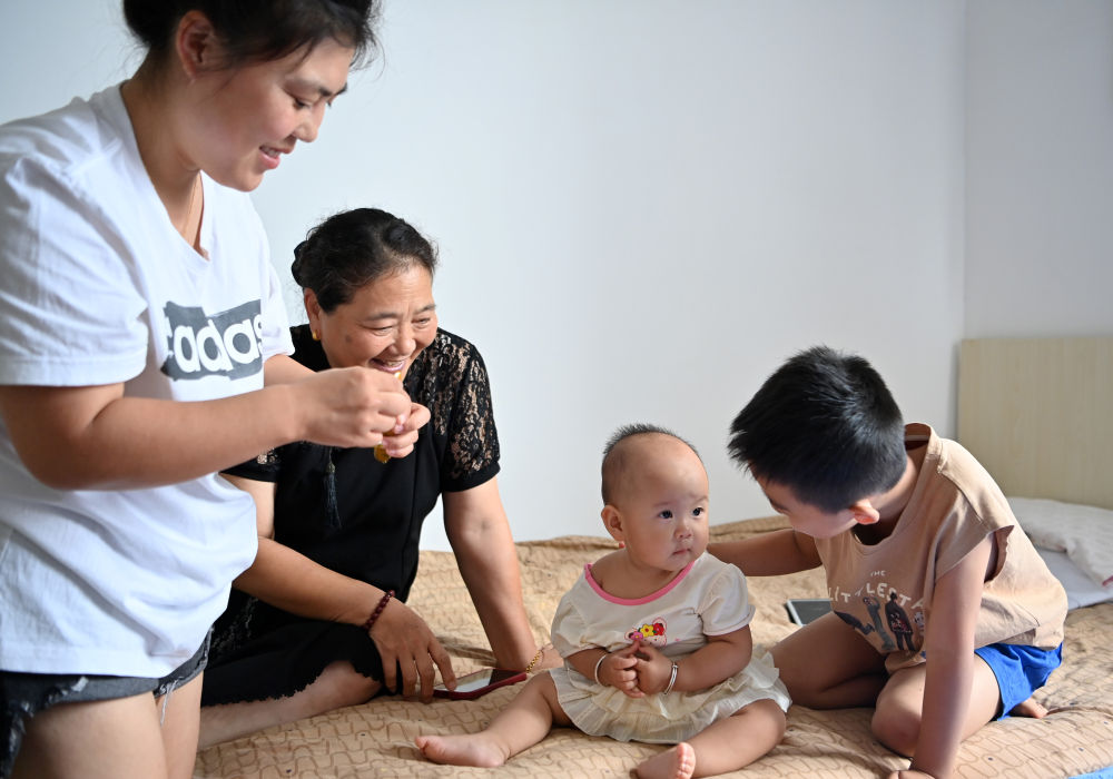 转移群众在亲和儒园安置点内照看小孩。新华社记者 李然 摄