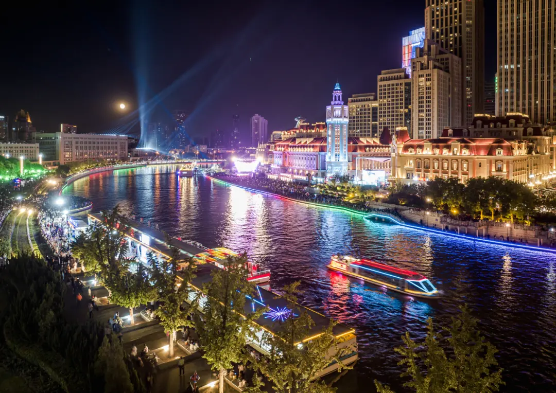 一场灯光秀,一座网红城。9月30日晚,当无人机搭载着“火凤”在海河上空飞舞,天津“大运河—海河”项目中首座新建成码头——“津湾码头”正式试开航,这也标志着“天津2023金秋海河文化体育旅游节”拉开大幕。与此同时,京津冀地区最大楼体光影秀点亮海河两岸,“海河游鸭”等吸引行人和游客驻足。灯光秀开启时,海河两岸人头攒动,地图软件上“拥堵”提示持续了近2小时,线上观众同步见证精彩,相关话题持续在短视频平台城市界面霸榜。不仅如此,“泰达航母公园大型焰火秀”“2023海河戏剧节”“天后宫福缘夜”等特色活动也在火热进行,吸引全国游客来津打卡。
