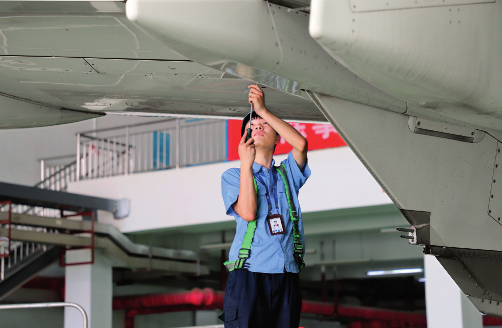 天津海特飞机工程有限公司工作人员在机库内进行维修作业(2022 年 5 月 18 日摄)赵子硕摄 / 本刊