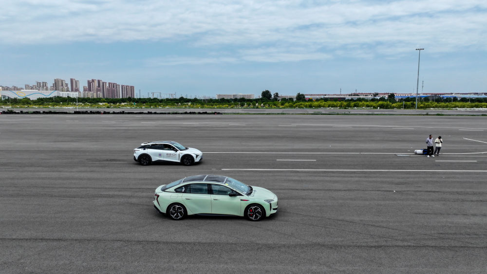 6月14日,智能网联测试车辆在天津(西青)国家级车联网先导区封闭测试场内进行自动驾驶主动安全功能测试(无人机照片)。 新华社记者 孙凡越 摄