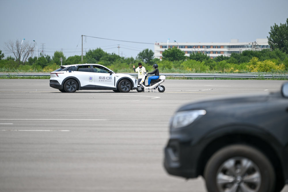 6月14日,在天津(西青)国家级车联网先导区封闭测试场,测试人员准备对一款智能网联汽车进行自动驾驶主动安全功能测试。 新华社记者 孙凡越 摄