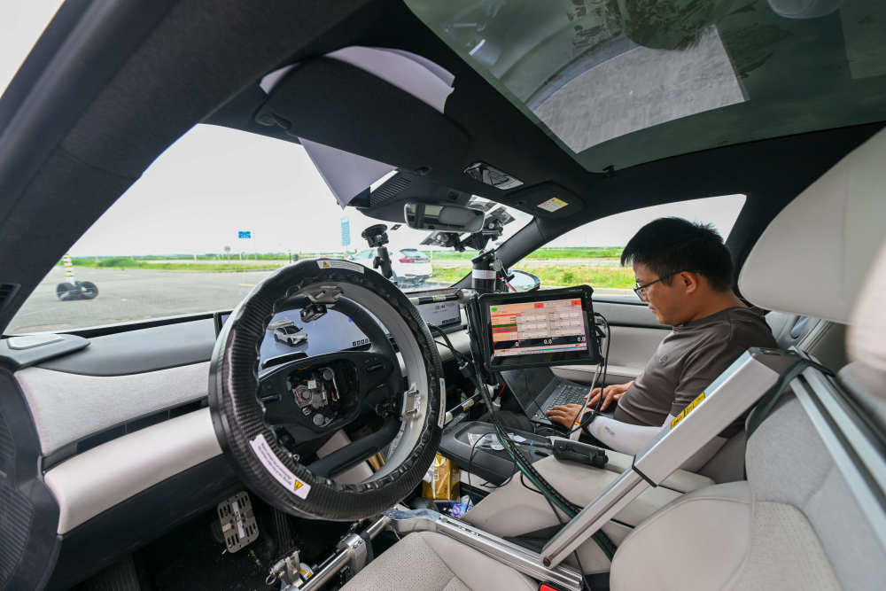 6月14日,在天津(西青)国家级车联网先导区封闭测试场,测试人员准备对一款智能网联汽车进行自动驾驶安全功能测试。 新华社记者 孙凡越 摄