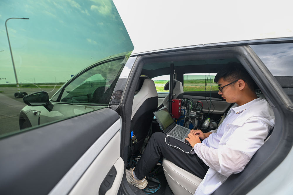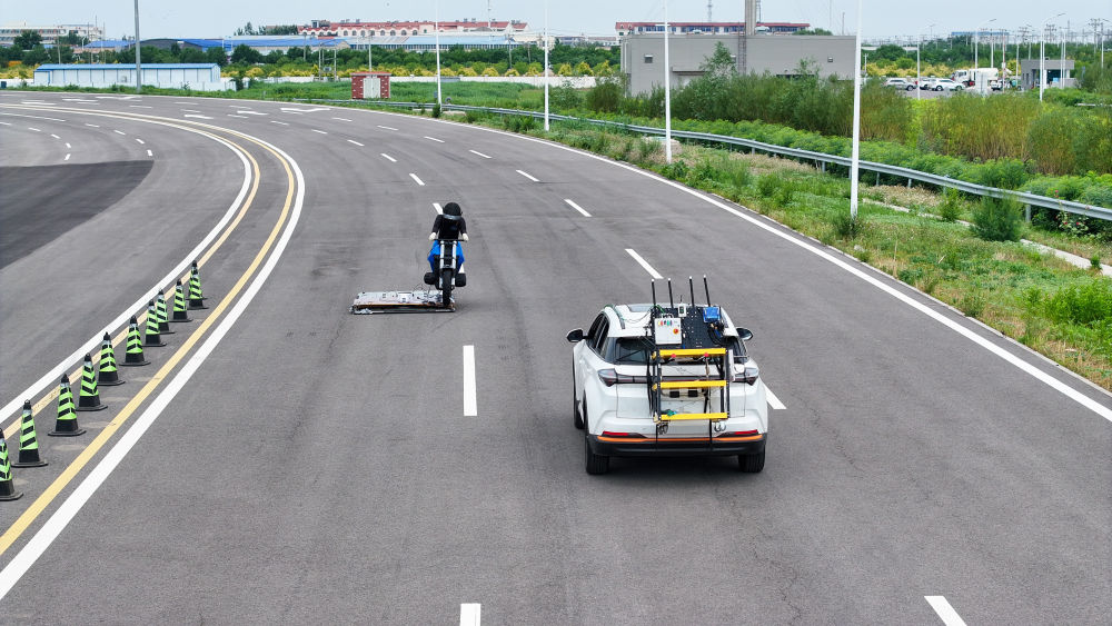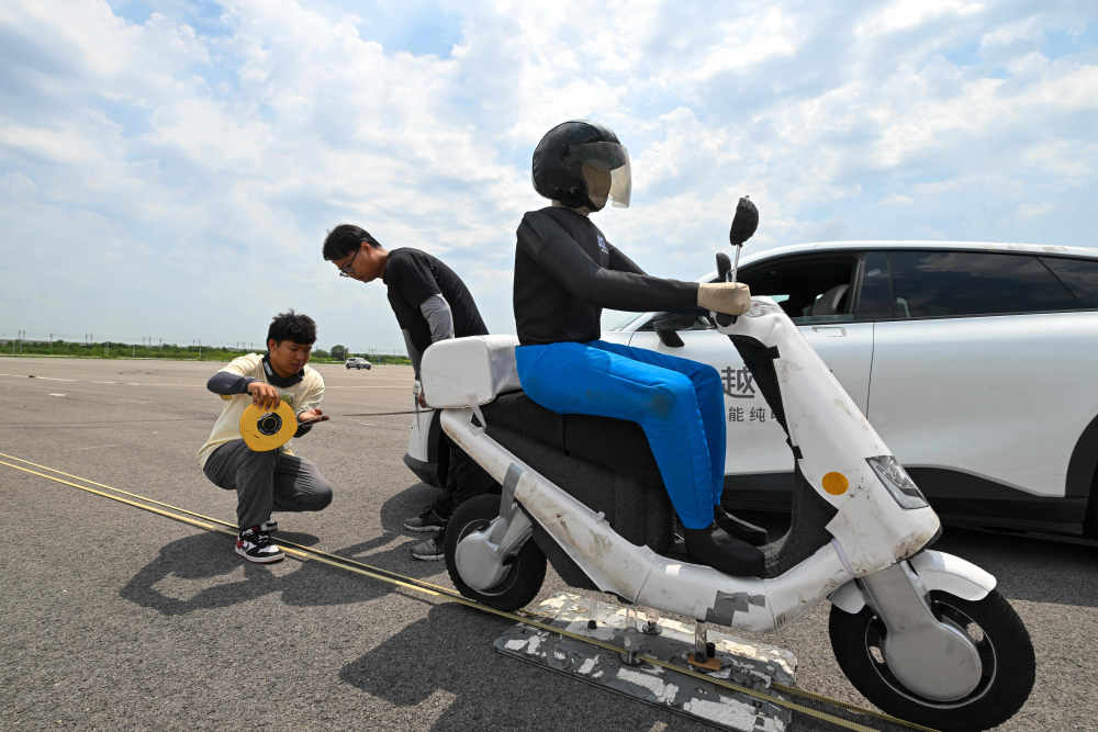 6月14日,测试人员对一款智能网联汽车转弯规避非机动车主动安全测试进行极限状态测量。 新华社记者 孙凡越 摄