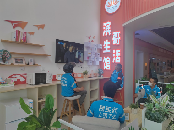 为更好服务新就业群体,生态城在外卖员、快递员较为集中的片区商圈、园区楼宇等点位设立党建指导站,在党群服务中心设立“滨哥生活馆”,创新打造“1123”服务体系。“‘1123’服务体系就是在设立1个‘滨哥生活馆’的基础上,再设立1个‘滨哥舒享家’、2个‘滨哥服务站’、3个小型‘滨哥补给点’,全方位为外卖员和快递员提供休息、饮水、充电等便利服务。”冯奈介绍道。