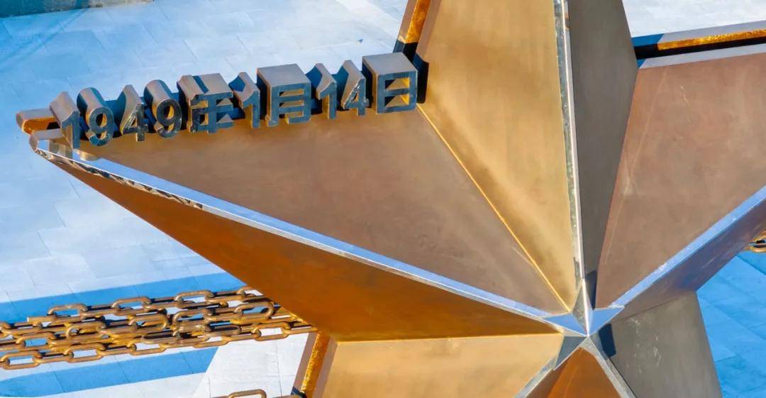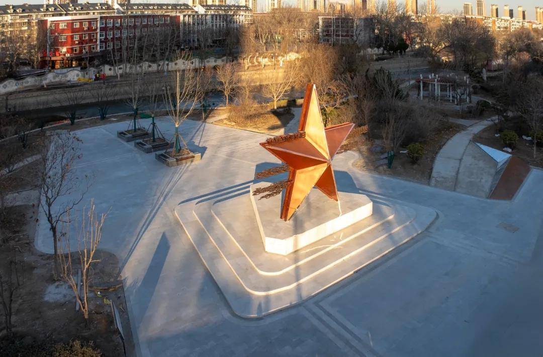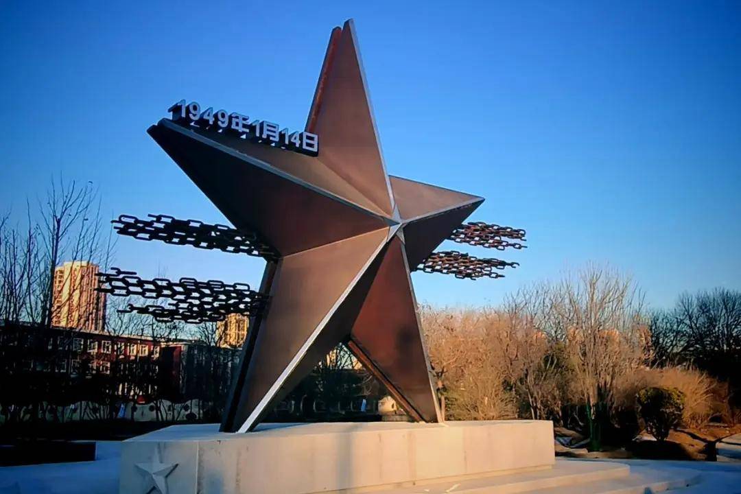 这座近日落成的“光荣之星”,由天津美术学院景育民教授设计——两颗奋力冲破束缚、即将交汇的大五角星,象征着东北野战军在1949年民权门战斗中英勇无畏、突破重围的历史瞬间;不锈钢材质边缘构建的小五角星寓意着我们铭记历史、缅怀英烈,传承红色基因。