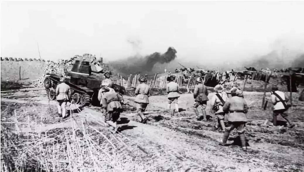 天津战役中,战士正在坦克的掩护下突破天津城防。