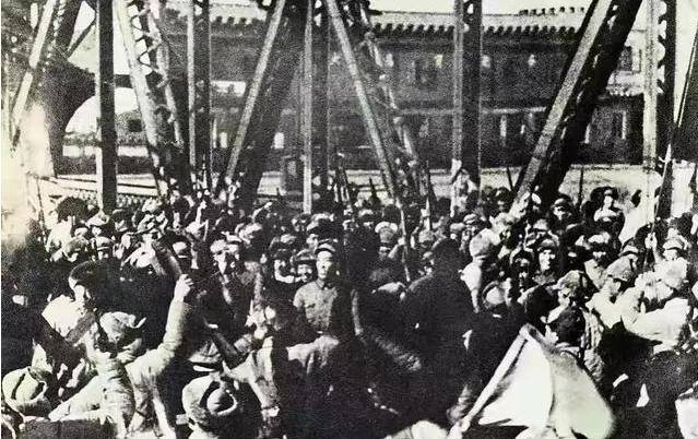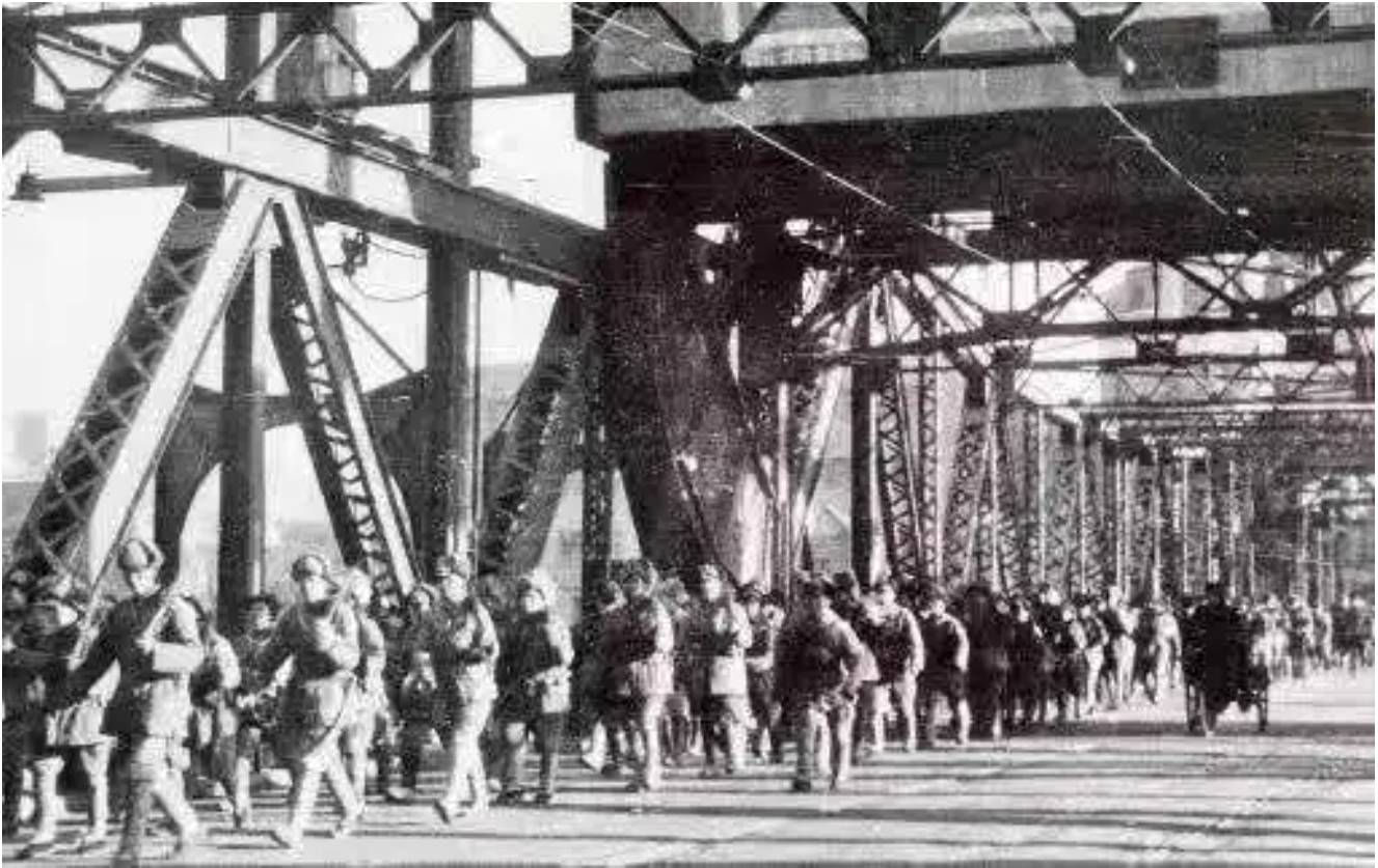 金汤桥会师,照片为新中国成立前夕前苏联随军摄影队在解放桥补拍。