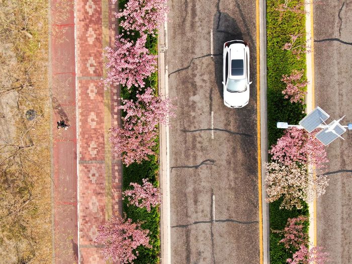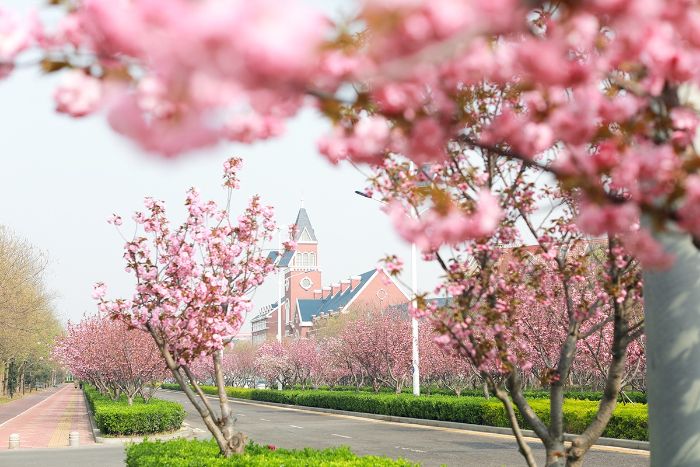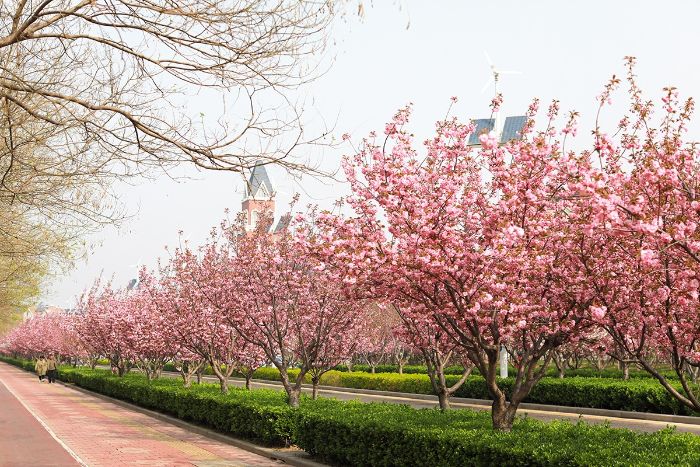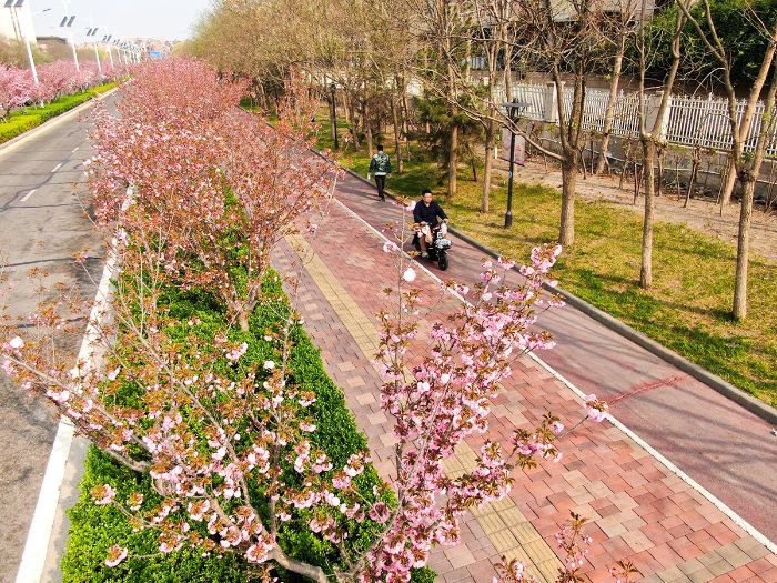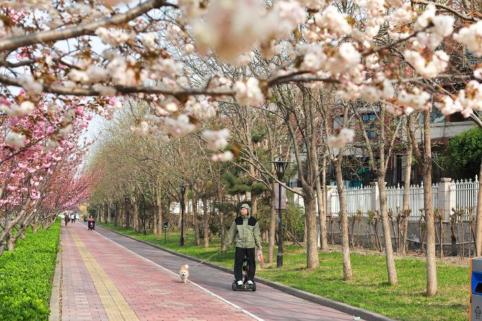 此刻,漫步在步行道上,便能被团团簇簇的樱花环绕,它们相互交织,形成了一条美轮美奂的“粉红色花带”,娇艳动人,成为春日里一道亮丽的风景线。