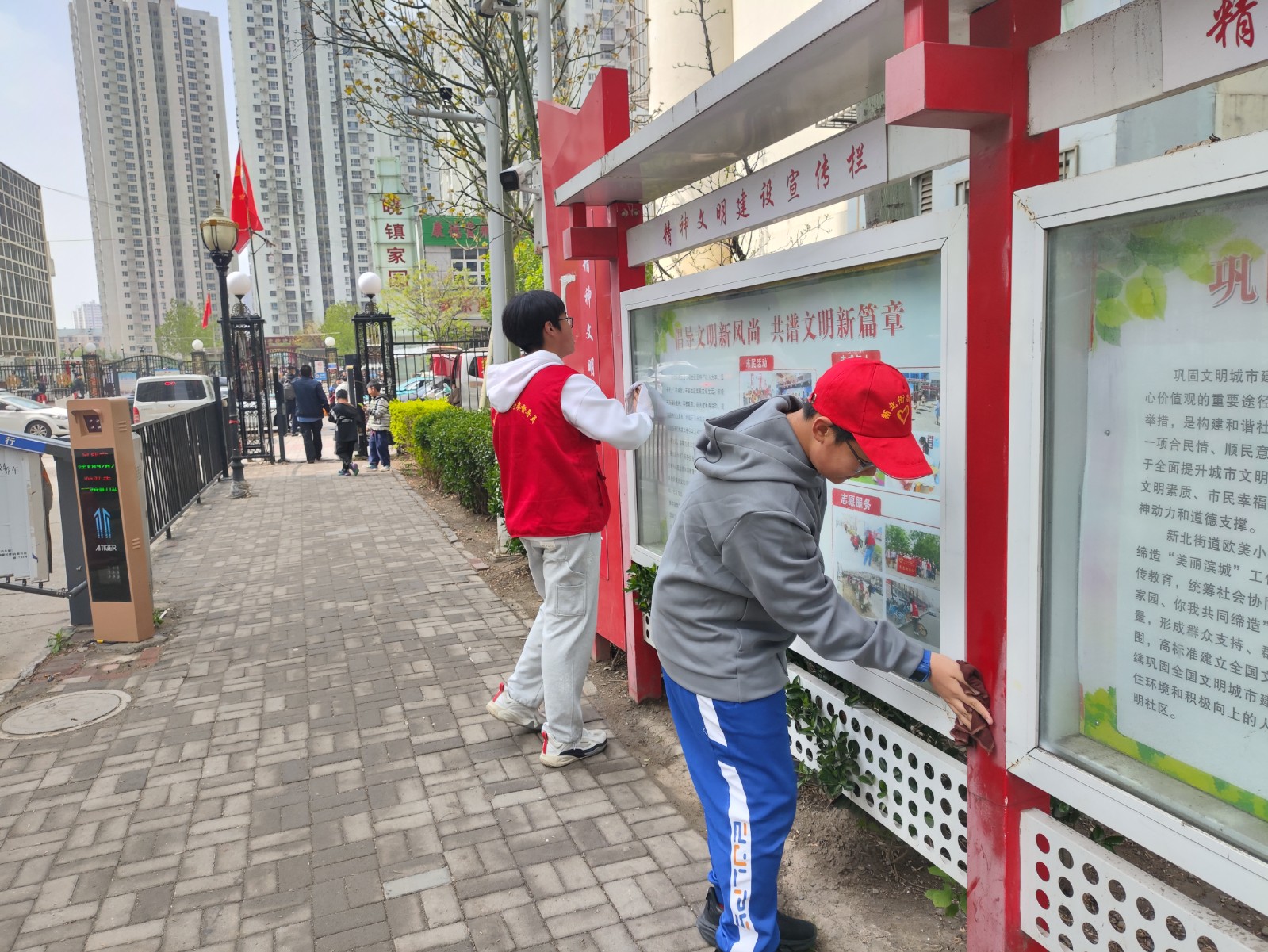 在欧美小镇社区,其中一组未成年人在擦拭宣传栏,小志愿者们认真地将宣传栏上的灰尘和污渍擦拭干净,有的打水,有的协助传递清洁工具,大家齐心协力,让宣传栏重新变得明亮清晰,使宣传内容能更好地展示给居民。另一组未成年人则到社区友好儿童活动广场,仔细清理广场上的果皮纸屑,以及冬青绿篱间的杂物,经过一番清整,广场面貌焕然一新。
