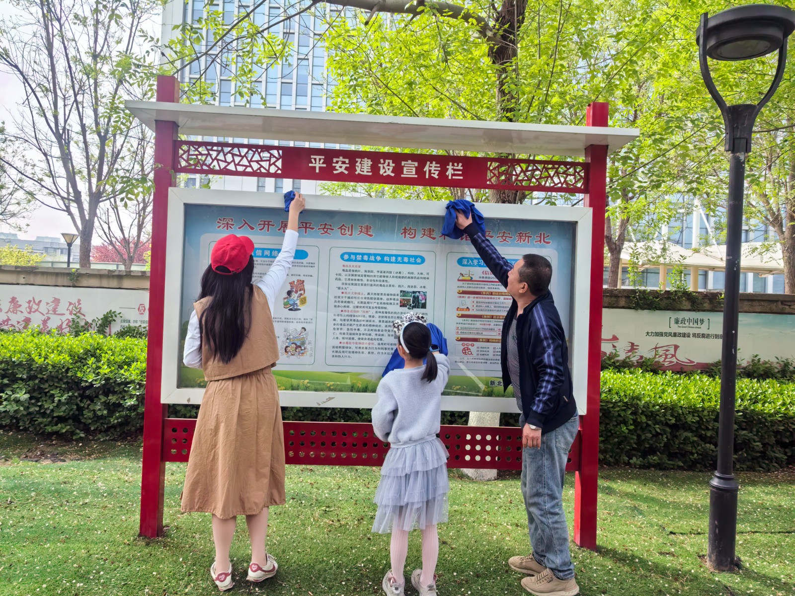 活动当天,志愿者分组有序开展工作。在贻锦台社区,成人志愿者手持垃圾夹、扫帚等工具,重点清理绿化带隐蔽垃圾、楼道杂物及卫生死角,累计清运垃圾20余袋;青少年志愿者则组成广告牌清洁小分队,用抹布、水桶对社区15处公益广告展牌进行细致擦洗,使宣传栏焕然一新。活动中,志愿者们分工明确、配合默契,既有老党员带头示范,也有家长带领孩子积极劳作,老少携手的生动场景吸引了不少居民主动加入进来。