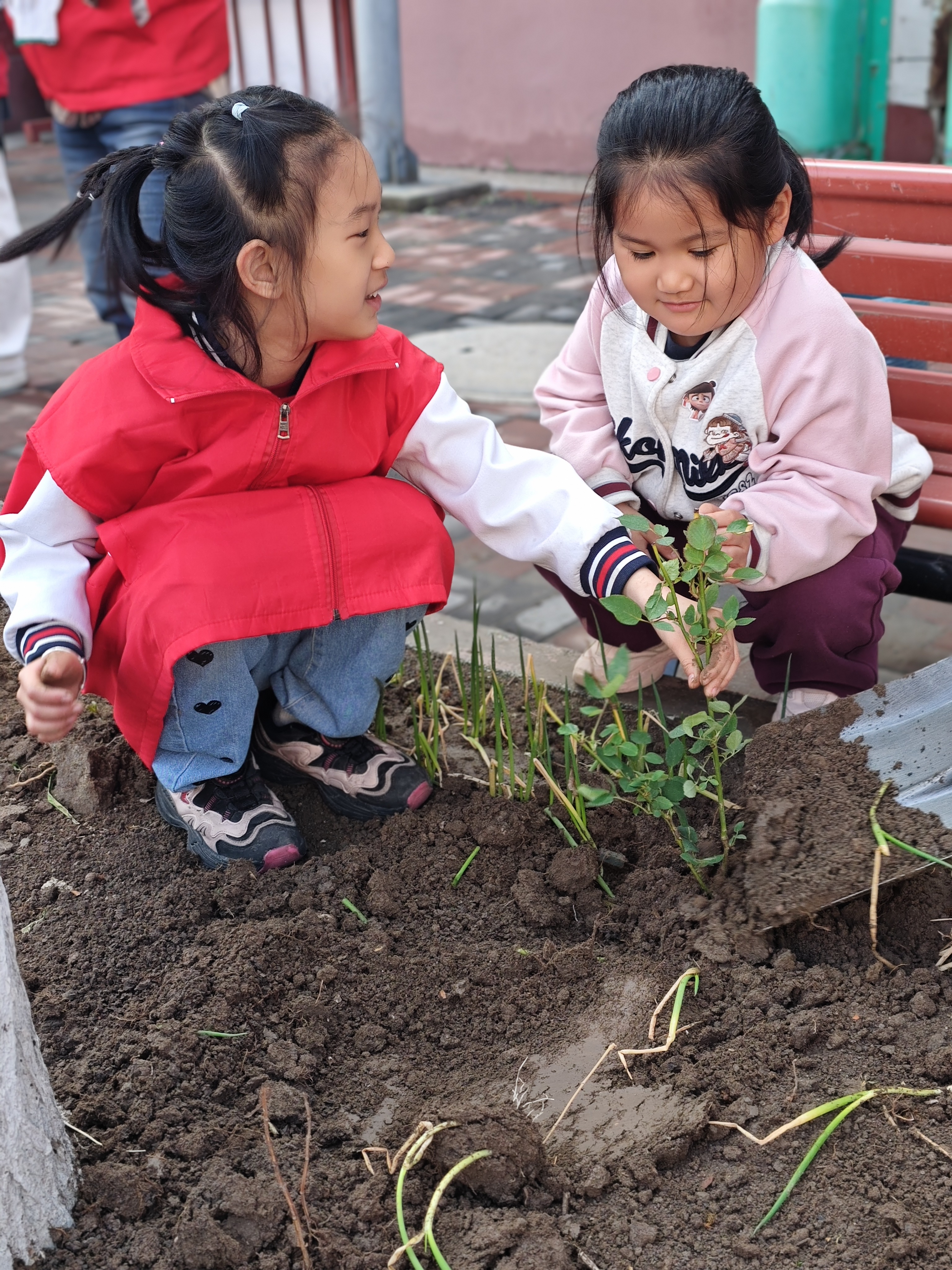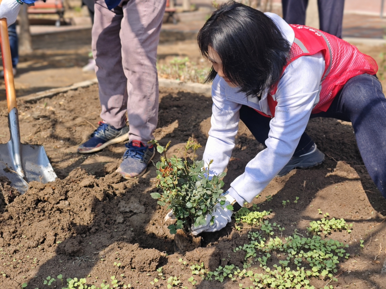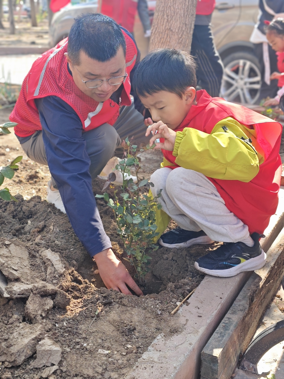 志愿者们在清理完绿地花坛和菜地后,又马不停蹄地开始了月季花的补种工作。大家分工明确,协作默契:有的负责挖坑,手持铁锹在地上挖出一个个大小适中的种植穴;有的负责放置花苗,将月季花苗小心翼翼地放入穴中,确保花苗根系舒展;还有的负责填土,将松软的土壤回填至穴内,轻轻压实,让花苗稳稳地立在土中;最后,大家纷纷提来水桶,为新种的月季花浇上“安家水”,让它们在新环境中茁壮成长。