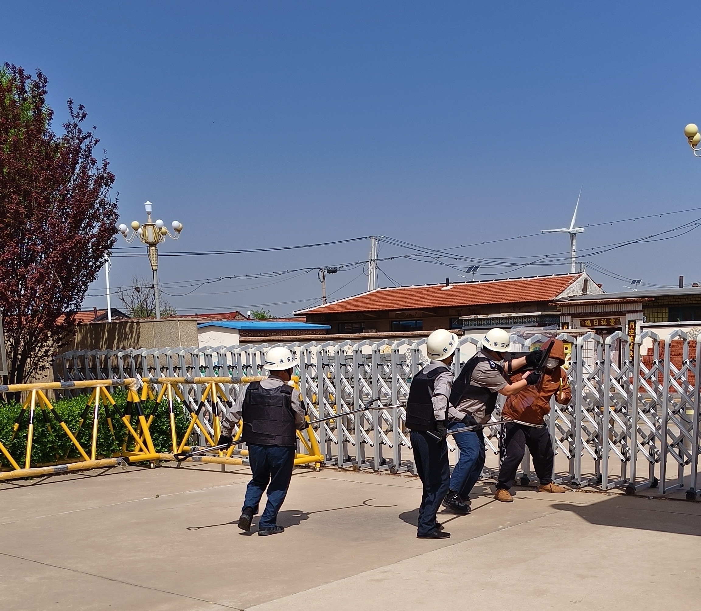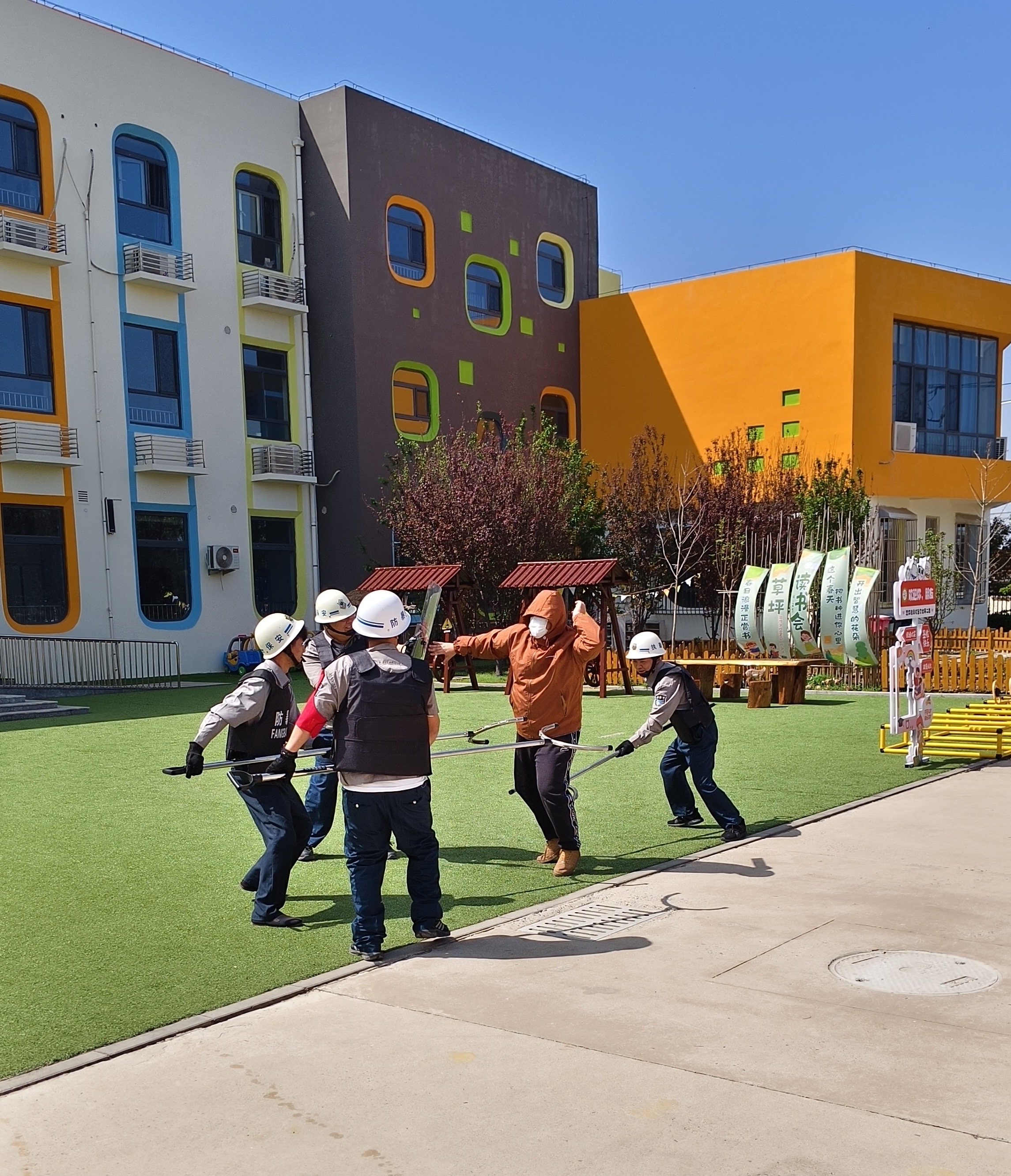 在演练中,装扮成“暴徒”的演练人员通过翻越护栏的方式,手持铁板闯入校园欲实施暴力行为,幼儿园立即启动应急方案,安保人员迅速拿起防暴叉与防暴盾牌进行拦截,园长第一时间启用了一键报警,并通知各班老师紧急带领幼儿疏散躲避。镇领导小组成员与民警随后赶到事发现场,并铐住了已经被防暴叉控制在地的“暴徒”。演练结束后,太平派出所的民警又对保安进行了专业化的防暴防恐装备使用方法的培训。