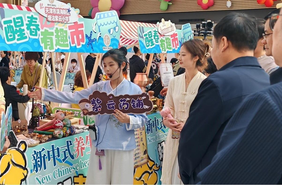 在为期三天的市集活动中,塘沽紫云小学和保税区临港实验学校设置了互动展位。在校学生动手制作的中草药饰品、香包和中药茶饮等特色产品吸引了众多市民驻足,成为展示校园中医药文化教育成果的重要窗口。