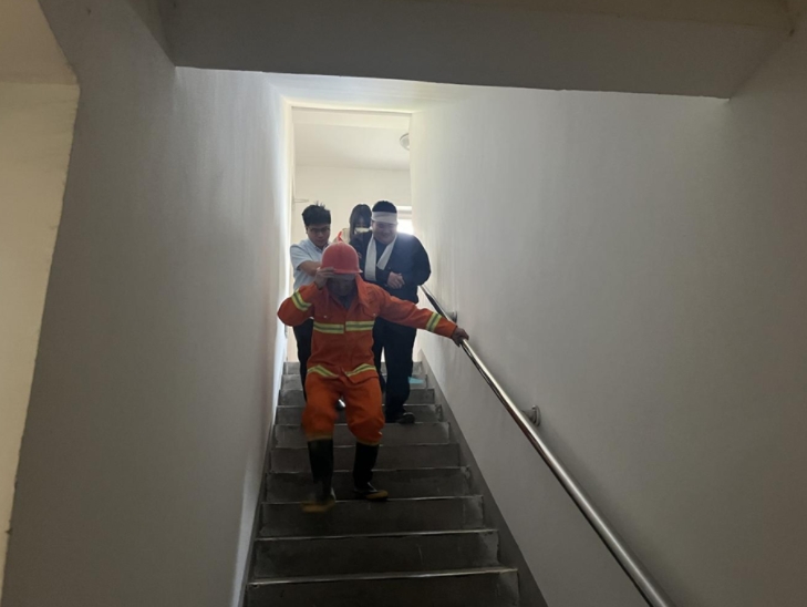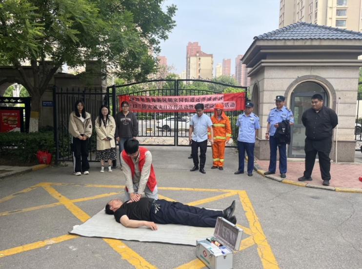 随着警报声响起,演练活动正式拉开帷幕。演练活动现场模拟暴雨导致小区严重积水的紧急情况,社区工作人员、物业公司工作人员立即启动应急预案,快速投入抢险工作。为防止积水涌入楼栋内部,工作人员争分夺秒搬运沙袋,迅速筑起临时防洪堤,有序疏散居民撤离危险区域,做好安置工作。同时,活动现场还模拟了地震场景,居民们在工作人员的引导下,低姿弯腰,在短时间内全部安全撤离至指定区域,有序完成“先避险、再逃生”的全流程应急演练,充分体现了社区应急响应机制的有效性和科学性。整个演练过程紧张有序,各环节衔接紧密。对模拟受伤的居民进行紧急救治和包扎处理,演示了心肺复苏等急救技能,进一步提升了自救互救能力,让居民们了解到在紧急情况下如何进行有效的自救互救。