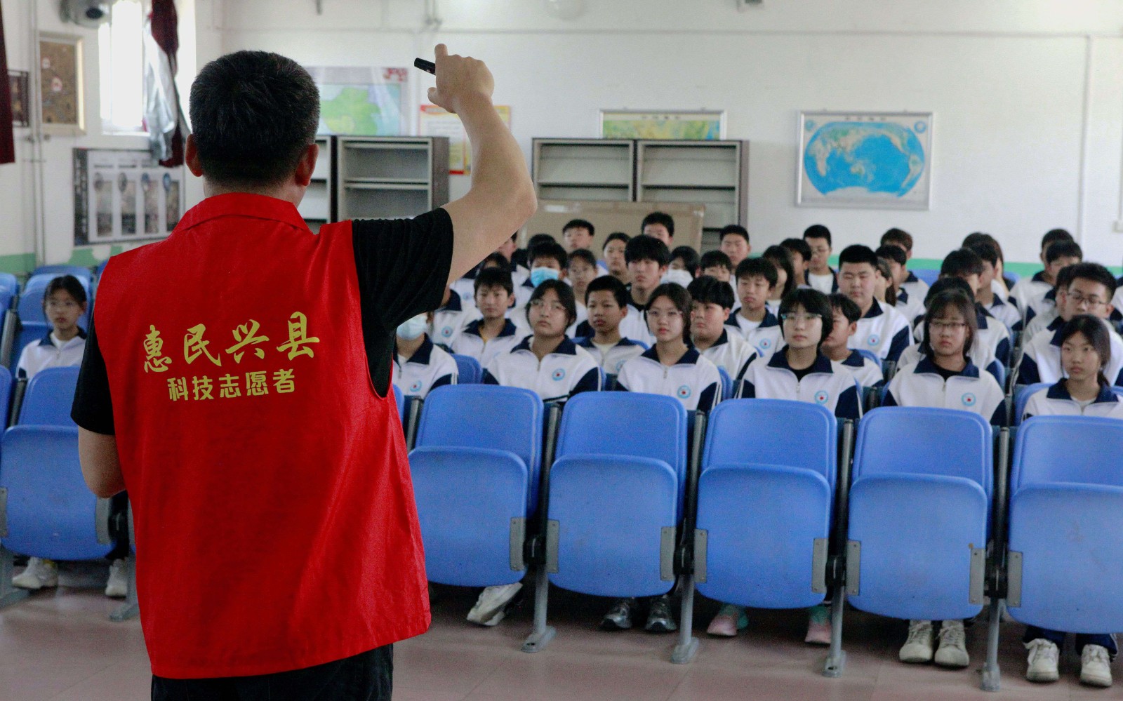 讲座中,徐鹏以生动的历史故事为引,将天气预报从古至今的发展历程娓娓道来。从古代依靠自然现象观测和经验总结预测天气,到如今借助高科技实现精准预报,学生们仿佛穿梭于时光隧道,见证了气象科学的飞速发展。他还详细介绍了天气预报节目主持人的素质要求,包括普通话等级、气象知识和地理知识等,鼓励学生们努力提升自己的综合素质。同时,他带领学生们学习了常用天气符号,如晴天、多云、阴天、阵雨、雷阵雨、小雨等,以及如何看懂天气预报图。通过讲解,学生们了解到预警信号的分类及含义,以及在播报气温时的注意事项。