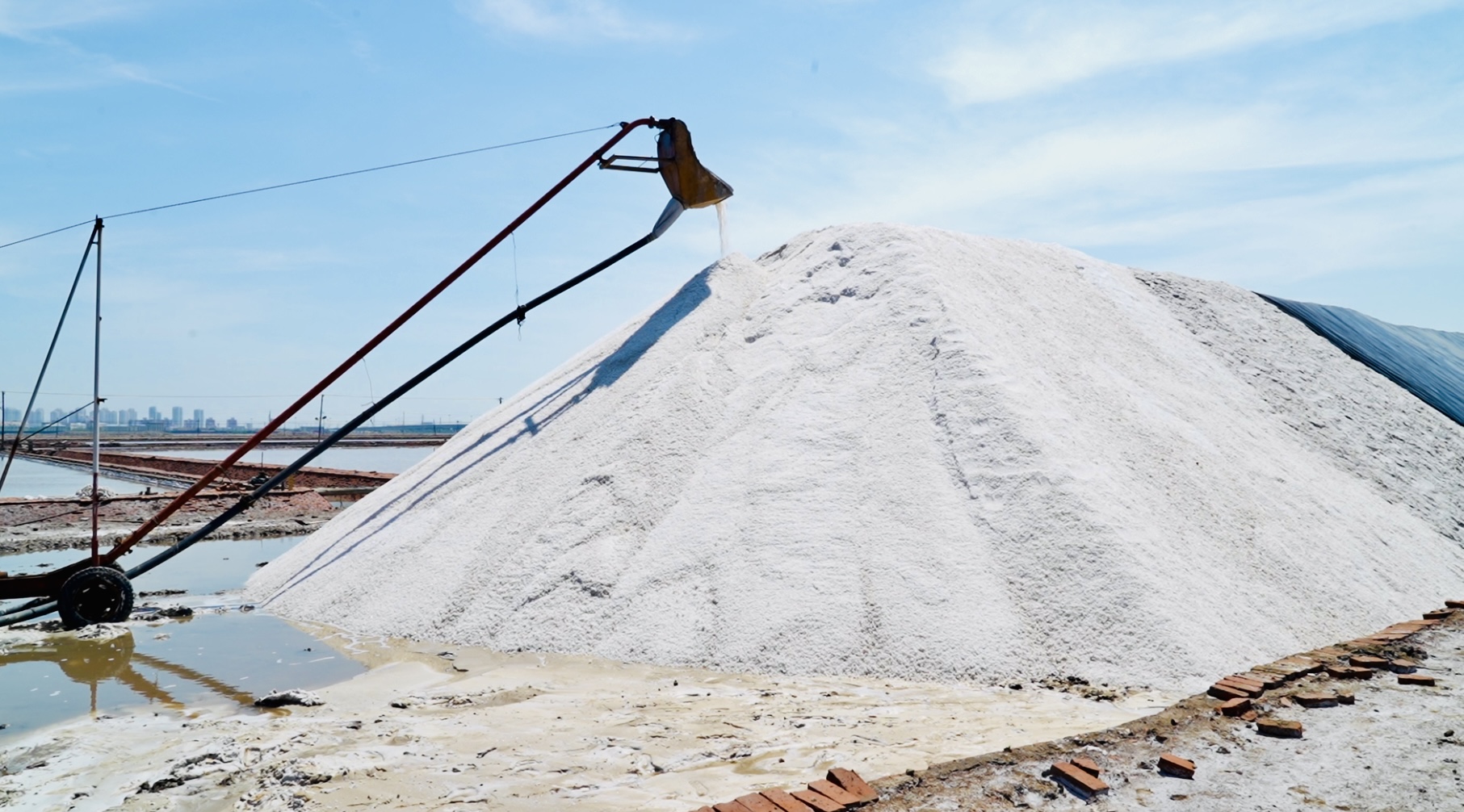 据悉,天津市滨海新区浅海滩涂面积达200平方公里,盐卤资源丰富,沿海地层防渗性好,原盐生产更是历史久远。天津长芦海晶集团滨海新区第一分公司作为本市最大、华北地区重要的原盐生产基地,目前已开发盐田169平方公里,原盐产能已突破100万吨。新收获的原盐在集坨场堆起连绵“雪山”,为本市乃至全国化工企业源源不断地输送着化工原料。这座有着760年悠久历史的长芦盐场,正用现代科技续写着“千年盐业”的新篇章。 “本次原盐采收工作将一直持续到6月底结束,力争生产优一级原盐54万吨,并有望提前实现时间过半产量过大半的奋斗目标。”该公司相关负责人指出。