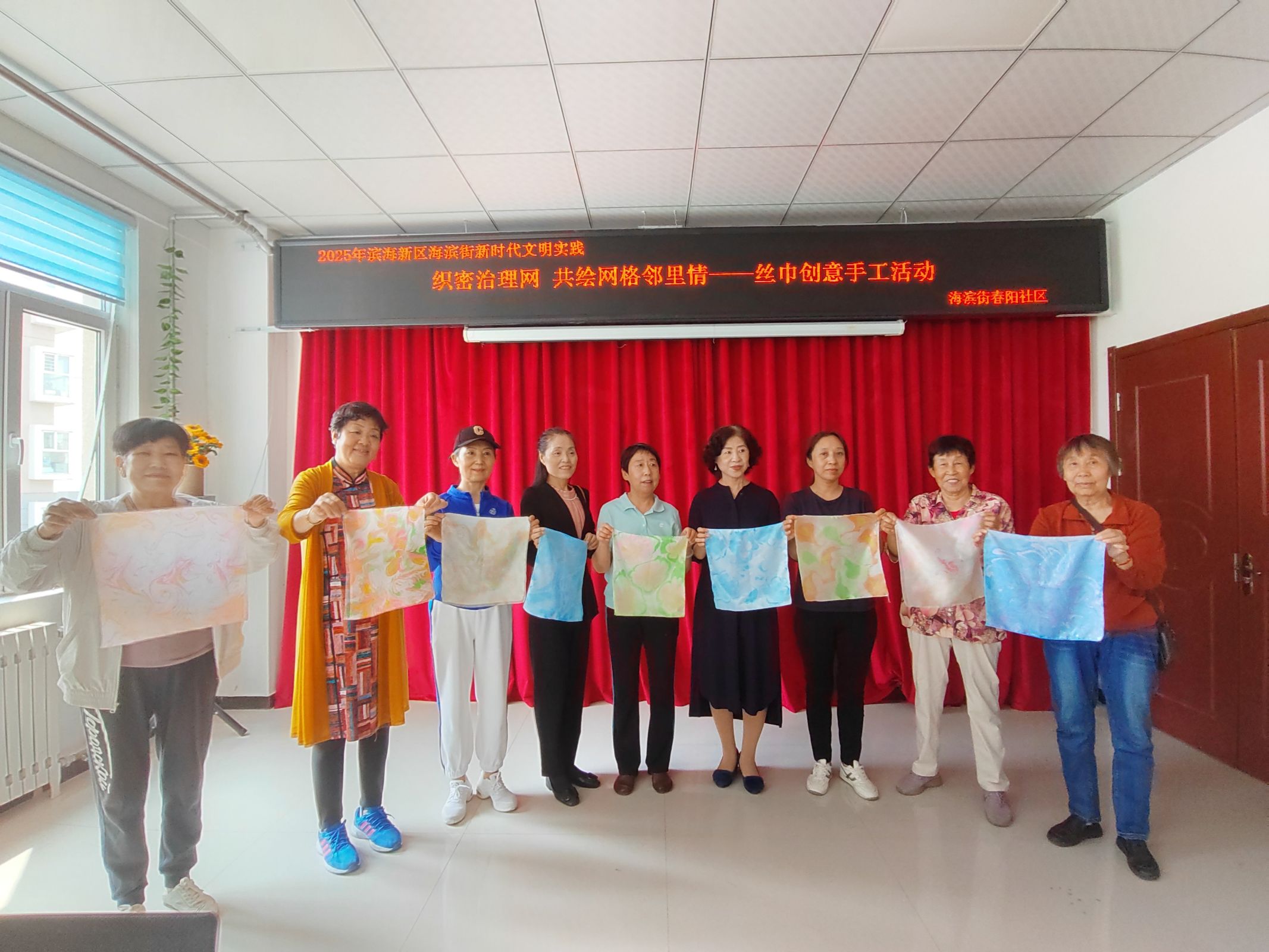 津滨网讯(记者 张爱萌 通讯员 杨宝银 摄影报道)近日,海滨街道社工站与春阳社区携手举办“织密治理网 共绘网格邻里情”春阳社区丝巾手工创意活动,活动以艺术为载体,串联网格治理与城市共建理念。