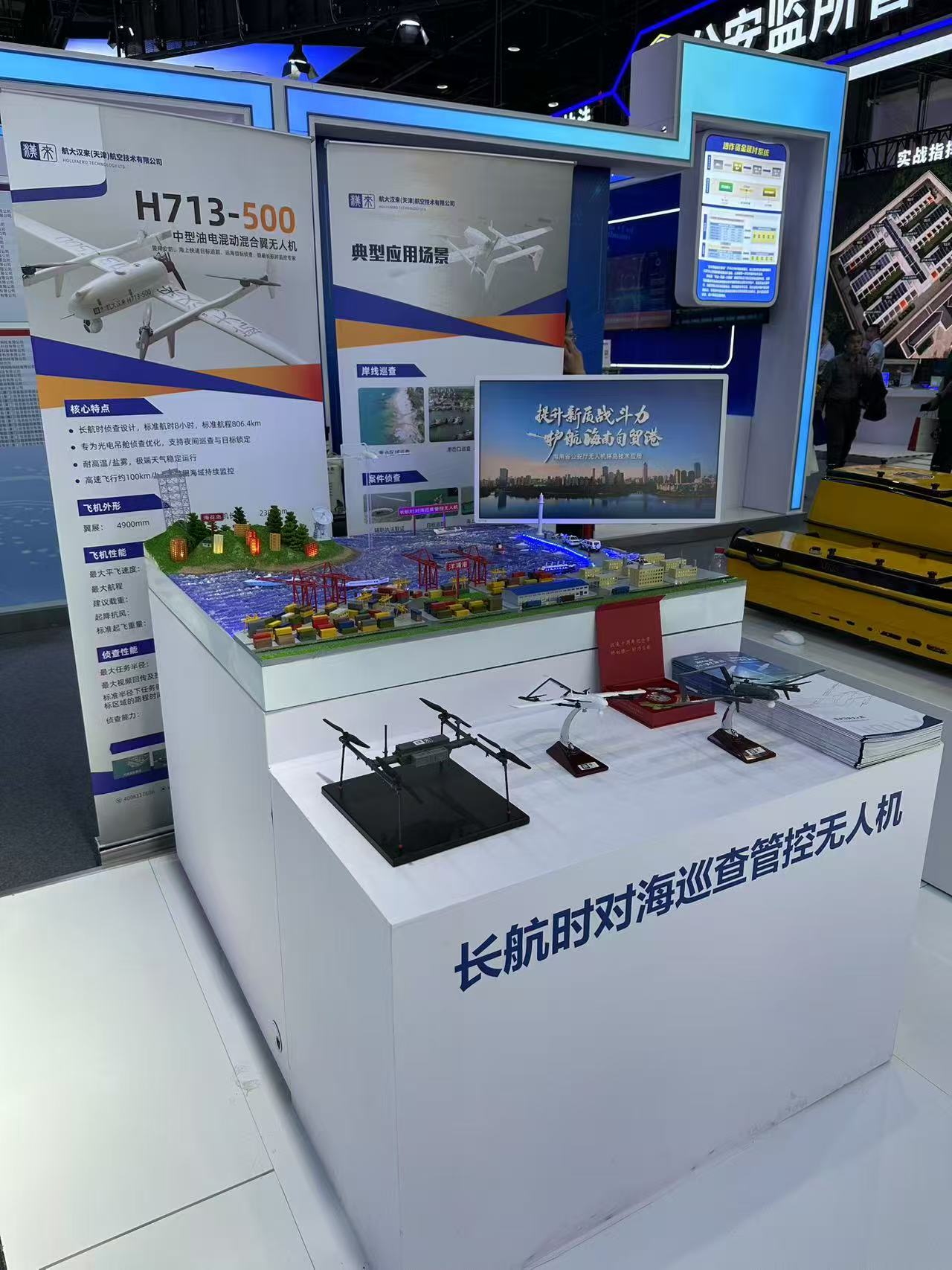 津滨网讯(记者 单毅 张惺卓 王鼎鑫)在近日闭幕的第12届中国国际警用装备博览会上,天津港保税区重点企业航大汉来(天津)航空技术有限公司自主研发的H713中型混合翼长航时无人机系统引发广泛关注。作为国家级高新技术企业,航大汉来联合海南省公安厅反走私和海岸管理总队,通过“实物+场景+讲解”的立体展示方式,全面呈现了其在警用无人机领域的技术突破与创新成果。