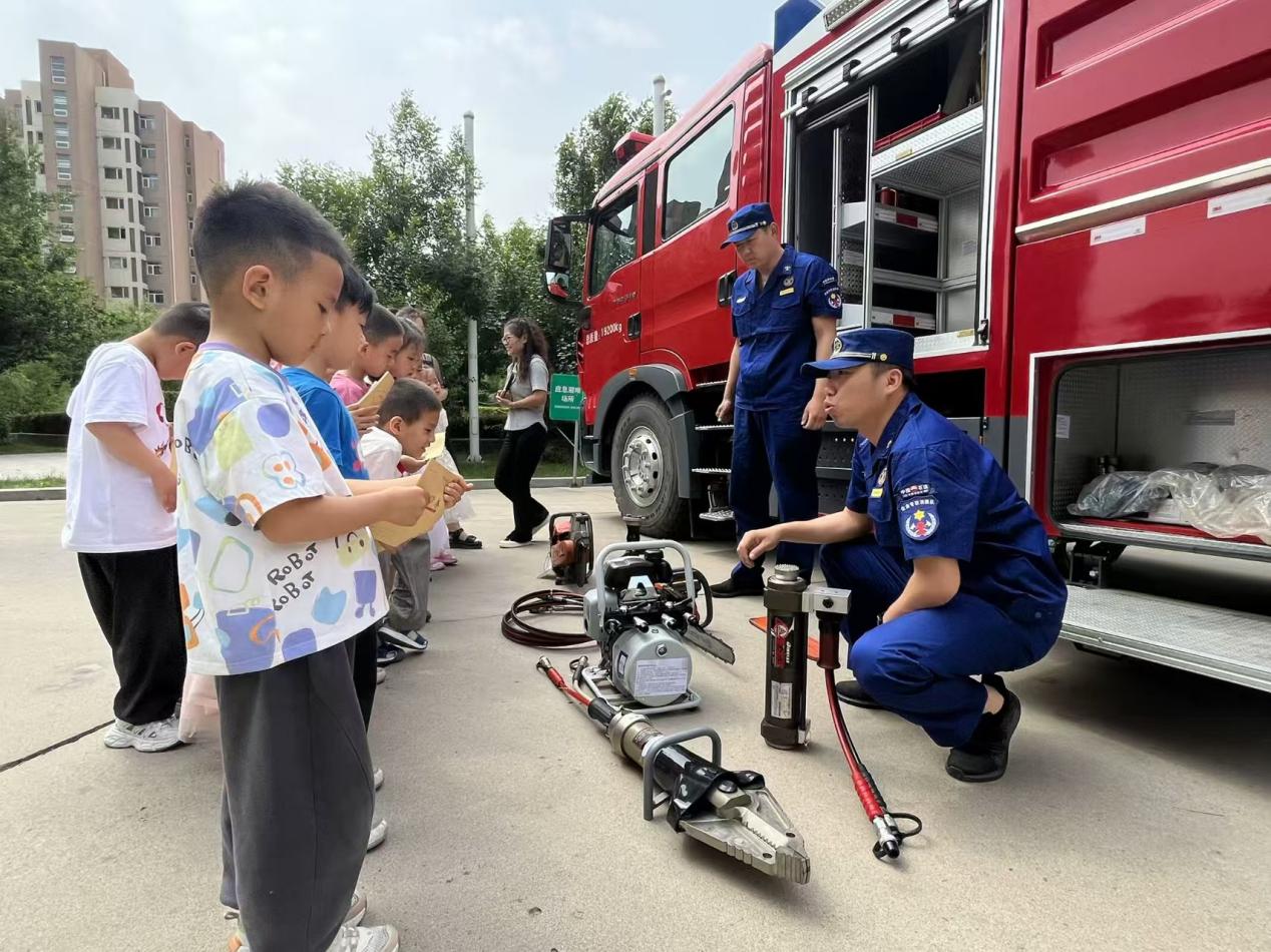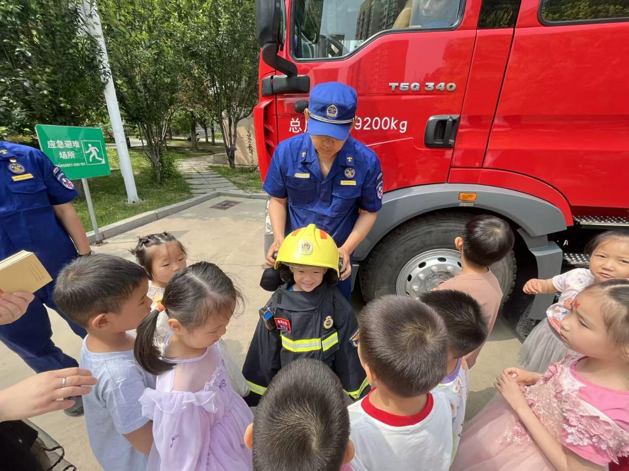 消防员首先用通俗易懂的语言,阐述了消防安全工作的重要性和必要性,结合近期全国发生的多起火灾案例,分析了目前容易存在的安全隐患。在消防员的带领下,孩子们有序参观了消防车辆和消防救援装备,孩子们围着消防车,眼里充满了好奇。在消防员的帮助下,孩子们穿上消防服,切实当了一回小小“消防员”,在沉浸式体验中深化安全意识。