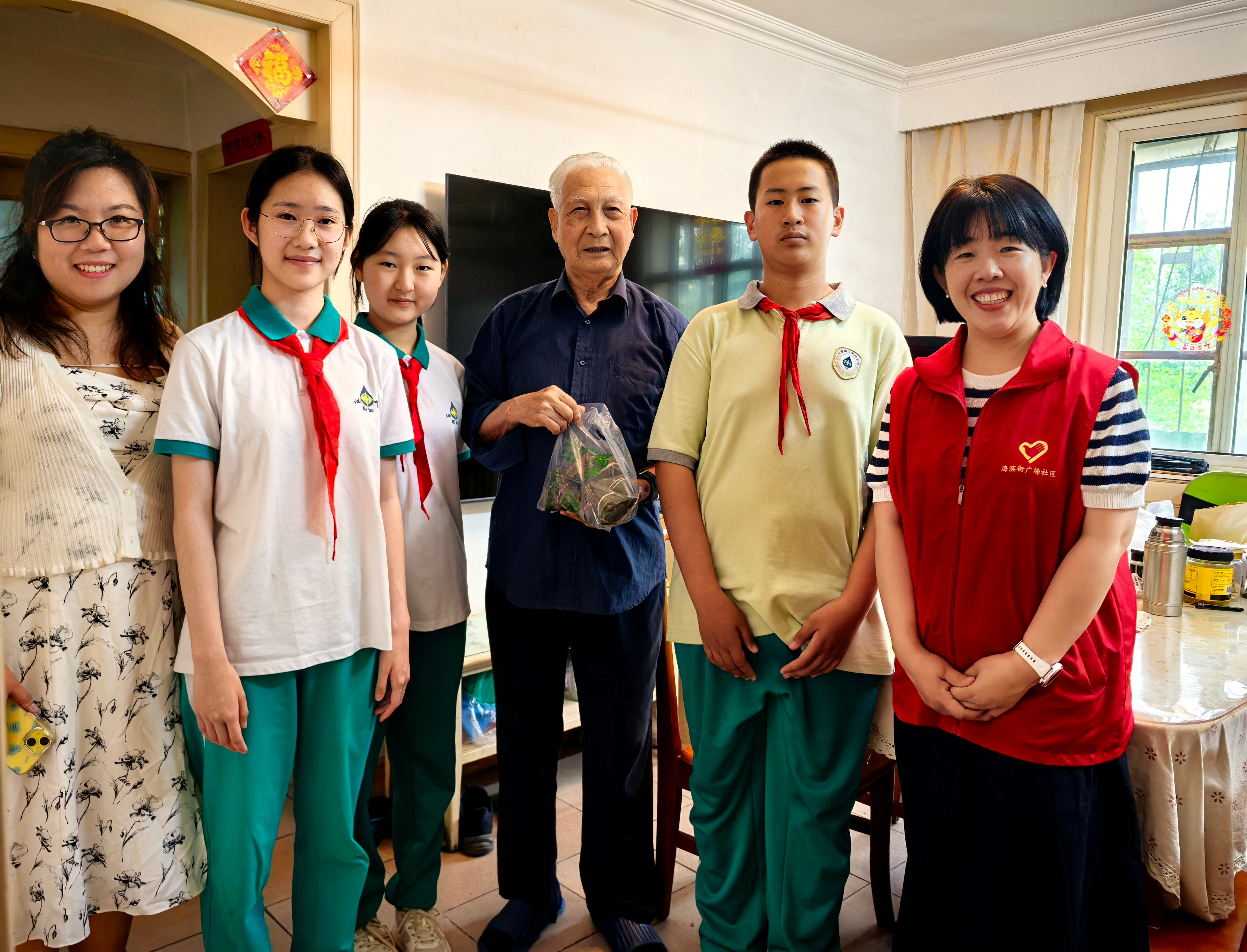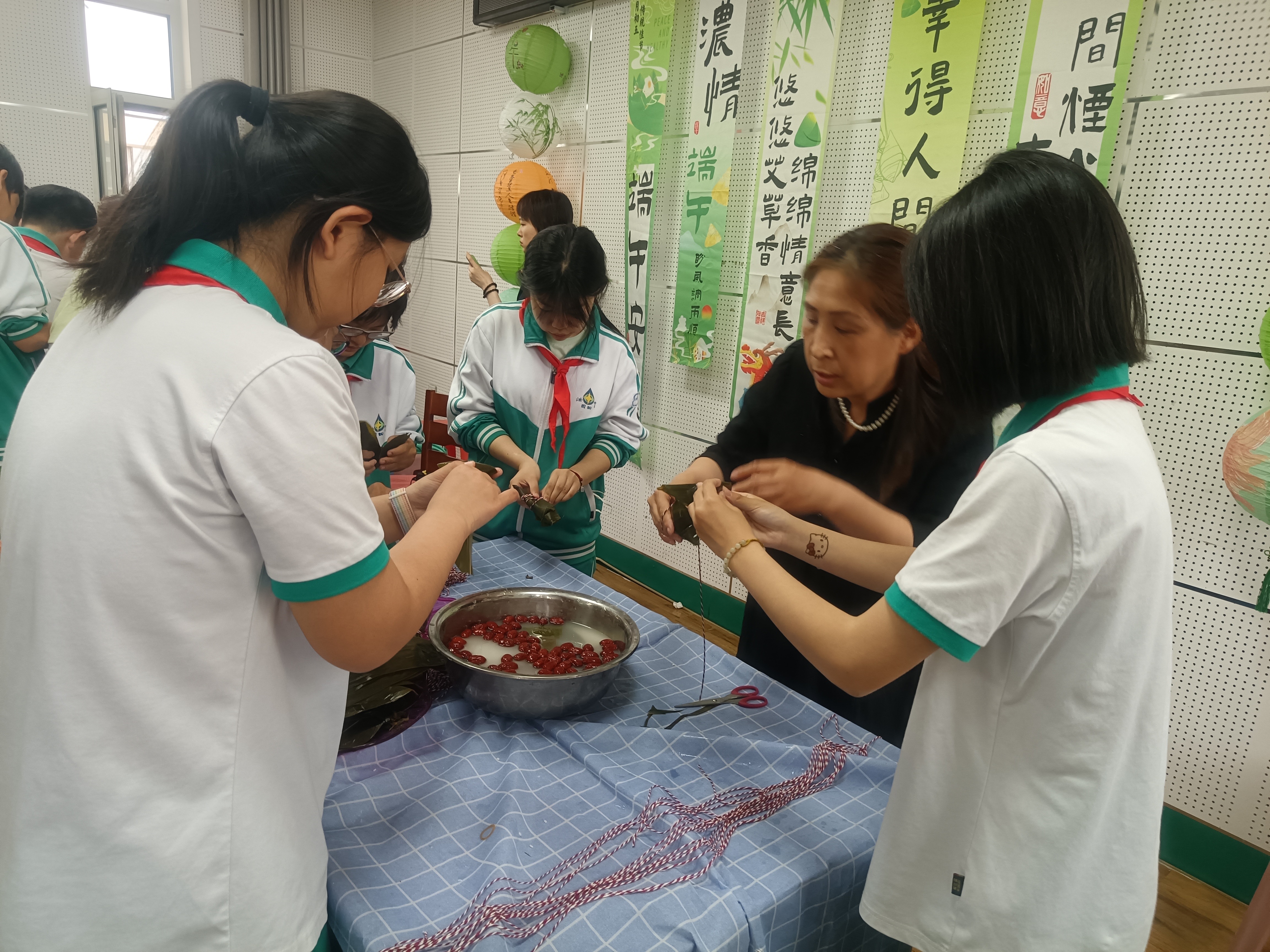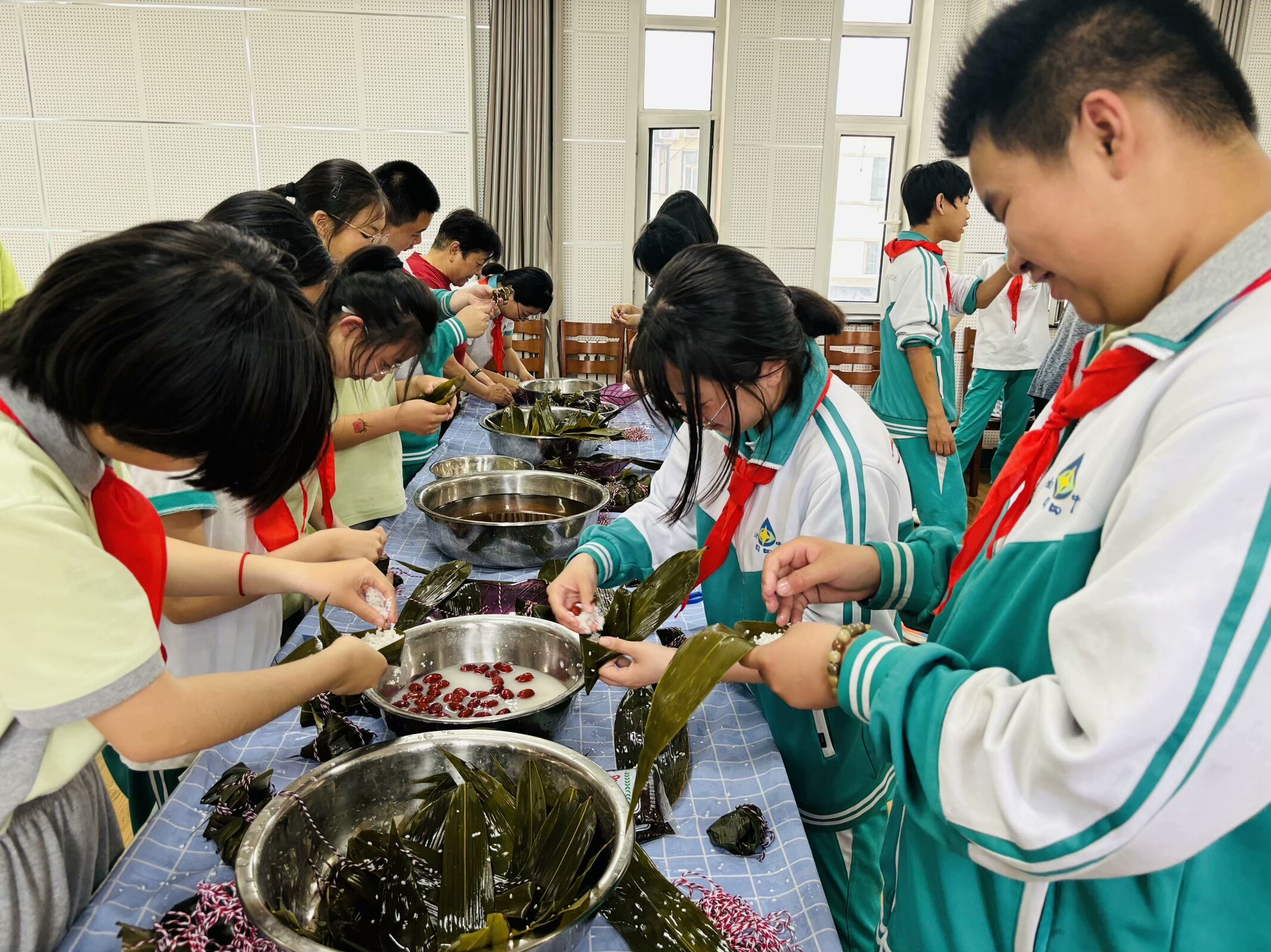 活动开始,工作人员向大家介绍端午节的由来,传统风俗和文化内涵,增进孩子们对中国传统文化的了解和兴趣,激发爱国情怀和民族自豪感。随后社区老人们给孩子们示范包粽子步骤:折粽子叶成漏斗状,填米放枣,压实封口、捆扎定型......学生们目不转睛的盯着老人的动作,跃跃欲试。在老人的指导下,孩子们拿起清香的粽叶、糯米和香甜的红枣,认真完成每一道工序,制作属于自己的粽子。大家围聚在一起一边包粽子,一边交流经验,活动现场欢声笑语不断,大家在浓浓的粽香味中共同感受端午节的喜悦。粽子包好后,工作人员带领学生将满载爱意的粽子送到社区高龄老人家中,传递节日祝福,祝福他们端午安康。