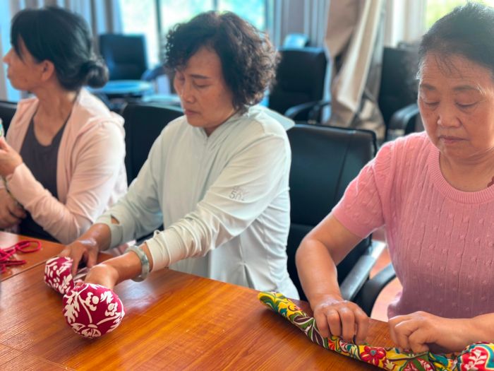 活动现场,社区包保相关负责人化身“手工老师”,手把手教居民制作艾草养生锤。“艾叶要揉出香气,布包缠紧才耐用。”70岁的刘大爷边学边感慨,“这老物件现在年轻人都不认识了,用它捶一捶肩膀,可比膏药还灵呢!”不少居民把做好的艾草锤挂上五彩绳,准备送给子女。