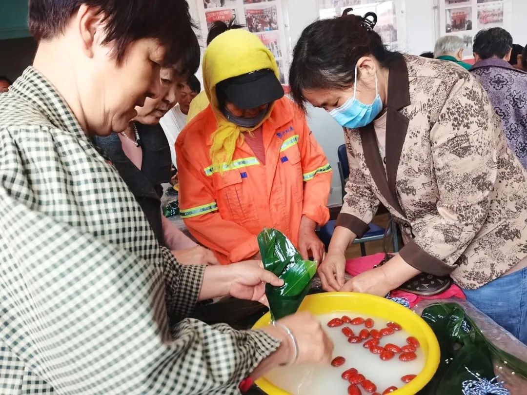 活动现场,糯米、粽叶、红枣、棉线整齐摆放在桌面上。大家各自拿出看家本领,捋粽叶、填糯米、压实、封口、捆绑,一片片清香的粽叶、一粒粒晶莹的糯米,在一双双巧手下转眼就变成了一个个诱人的粽子。大家相互交流包粽子的诀窍,包出了三角形的、四边形的、菱形的粽子,尽情享受包粽子带来的乐趣。在包粽子的过程中,不仅增进了邻里间的友情,还拉近了彼此间的距离。
