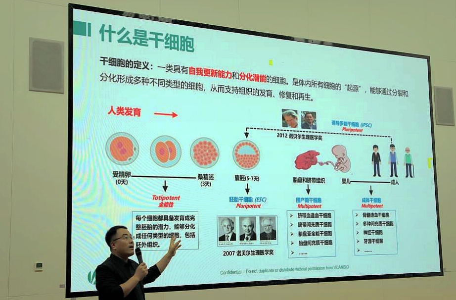 随后,杜为博士向同学们揭开了干细胞这一生命科学前沿领域的神秘面纱。他详细介绍了三种应用广泛的干细胞类型及其在临床应用中的最新动态,生动阐述了这些被称为 “生命的种子” 的干细胞,在人体发育、疾病治疗和人道主义关怀中所扮演的至关重要的角色。尤其结合中源协和旗下天津脐血库的实际案例,展示了干细胞科技从实验室走向临床应用,真正造福人类健康的历程。当分享到一份在天津脐血库冻存长达 19 年的脐带血,通过自体移植成功治愈了一名重型再生障碍性贫血患者的真实故事时,报告厅内响起了惊叹与掌声。这一鲜活的案例不仅让同学们为患者重获新生而感到由衷高兴,更让他们深刻感受到了中国生物科技发展的强劲脉动,以及中源协和在生命科技领域坚守的责任与价值,激发了他们对生命科学探索的热情。