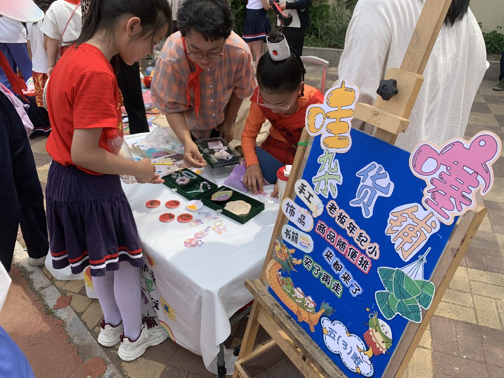 文艺汇演结束后,开启了义卖活动,孩子们以实际行动为节日增添了特殊而珍贵的意义。义卖现场宛如一个色彩斑斓的童趣世界。由孩子们和老师、家长共同精心布置的摊位一个个排列开来,琳琅满目的“商品”铺满摊位:有孩子们亲手绘制、充满奇思妙想的画作;有利用废旧材料巧妙制作、独一无二的手工艺品;还有陪伴他们成长的、承载着美好记忆的书籍玩具。稚嫩而热情的“小掌柜”们主动介绍着自己的“宝贝”,认真投入地完成一笔笔充满意义的“交易”,从略显羞涩到逐渐自信大方的成长瞬间令人动容。