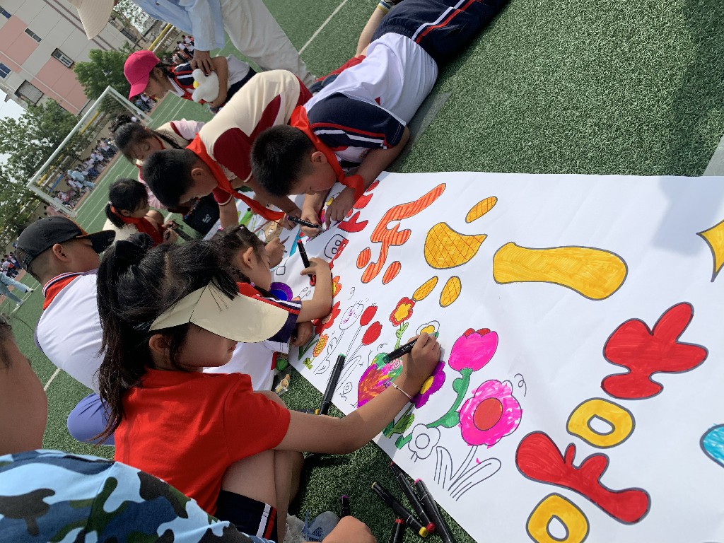 同时,在操场的草坪中央,5米长卷缓缓展开,上面绘制着“童乐六一 喜迎端午”主题漫画,小朋友们手执喜欢的颜色,用想象力绘制他们心中的图景,孩子们俯身专注涂画,阳光在画卷上投下跃动的光斑,整幅长卷渐渐染上童真的色彩,每一笔都跳跃着丰富的想象力。草坪间,欢声笑语不断;画卷上,五彩缤纷的图画逐渐浮现。