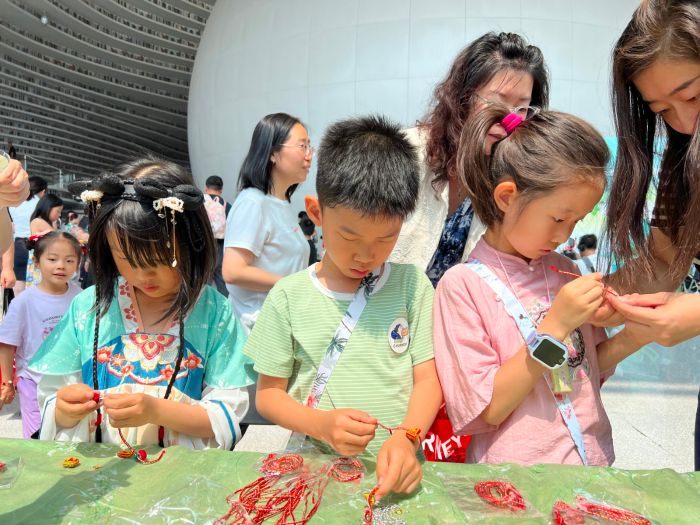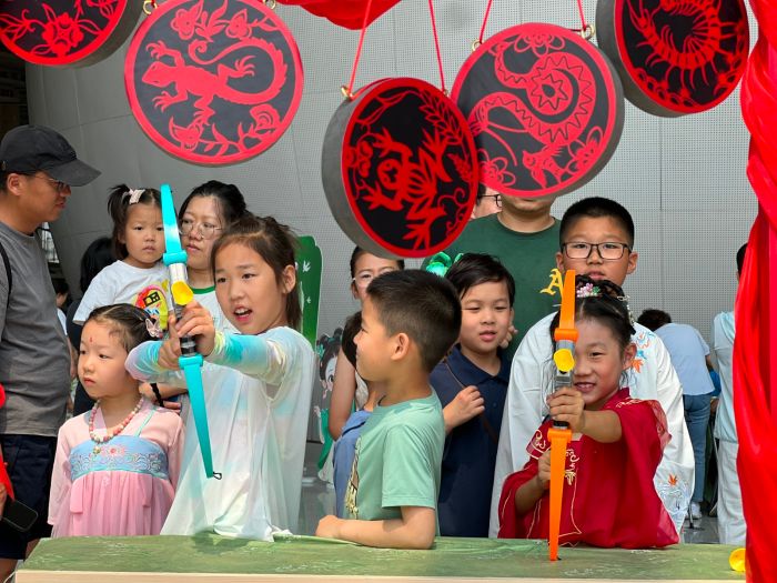 活字印刷,散发墨香。读者们在工作人员的指导下,亲手触摸古老的活字,排版、刷墨、拓印,将自己喜爱的诗词印刻在纸张上,感受着千年文脉在指尖流淌,体会传统印刷术的独特魅力;在射“五毒”挑战区域,读者们手持小弓箭,瞄准印有“五毒”图案的靶子,既锻炼了动手能力,又在欢声笑语中了解了端午驱邪纳福的传统寓意;五彩绳工坊同样人气爆棚,大家精心挑选彩绳,编织出蕴含美好祝福的五彩绳。