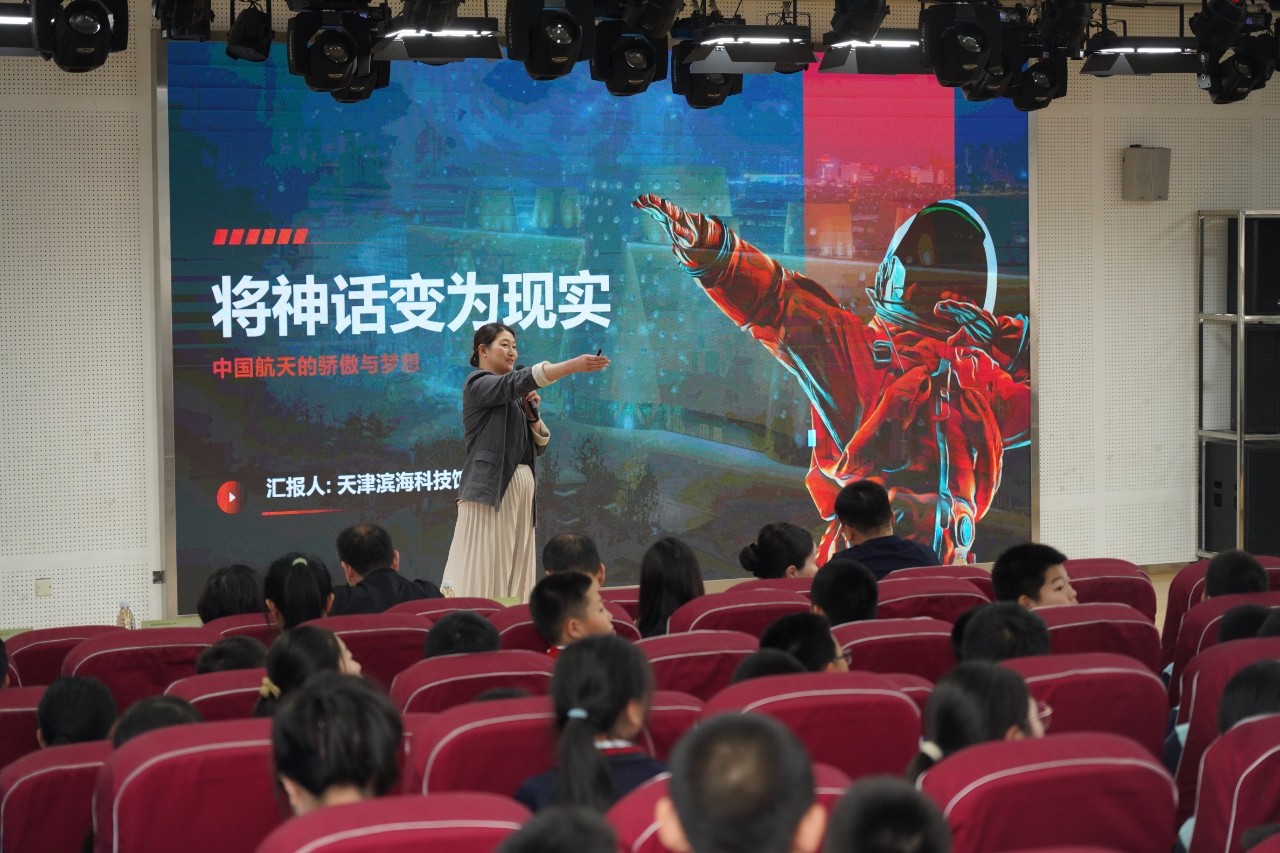 活动期间,天津市军粮城中学、滨海新区新北第二小学分别联合滨海科技馆举办了专题科普讲座,作为天津市多所中小学校外科学副校长,滨海科技馆馆长沈劲蓉以“用科学思维观察人工智能”“将神话变为现实的中国航天”两大主题,采用互动问答、跨学科情景模拟等教学模式,为两校500余名师生带来沉浸式科普体验,将前沿科技知识转化为贴近青少年认知的生动内容,有效构建起“听得懂、学得会、用得活”的科普教育创新范式。
