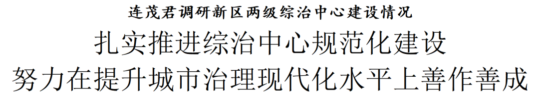 津滨网讯(记者 徐晶晶)6月4日,区委书记连茂君调研新区两级综治中心建设情况。他强调,要深入贯彻习近平总书记关于社会治安综合治理中心工作的重要指示和视察天津重要讲话精神,坚持和发展新时代“枫桥经验”,扎实推进综治中心规范化建设,切实有效化解矛盾纠纷,持续增强为民服务能力,努力在提升城市治理现代化水平上善作善成。
