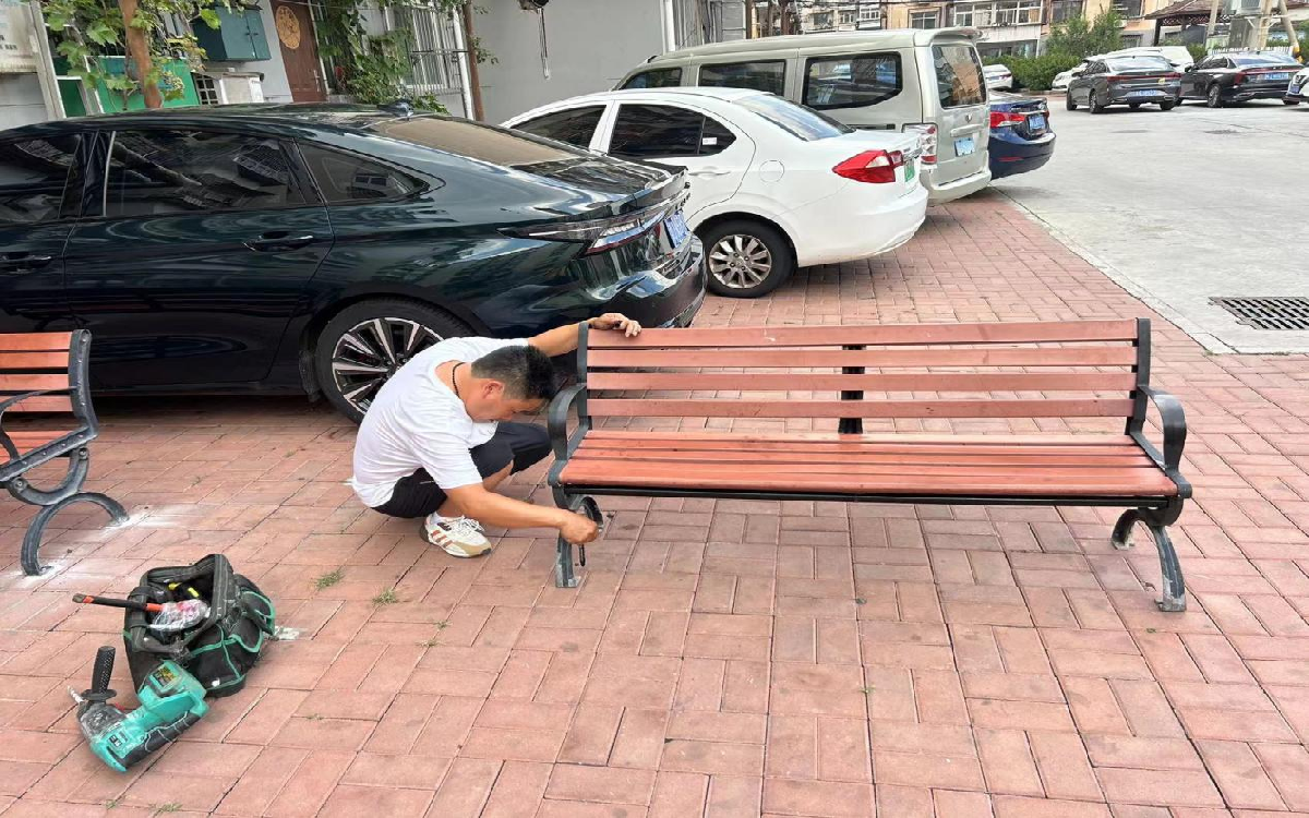 位于中心北里小区健身器材小广场上的多把便民长椅由于风吹日晒、年久失修出现了严重松动现象,影响了居民正常使用。2024年盛夏,当牛师傅得知这个情况后,干脆利落地说了句“这事交给我吧”,便主动无偿地包揽了维修工作。他第一时间自掏腰包自行配齐了丢失的长椅螺丝,冒着40℃的高温蹲守广场,像修复艺术品般拼接木板、加固支架,逐个将长椅进行维修,即便汗水浸透衣背也浑然不觉。一把把焕然一新的长椅,不仅托起了老人休憩的身影,更承载着“城市匠人”对社区的深情。