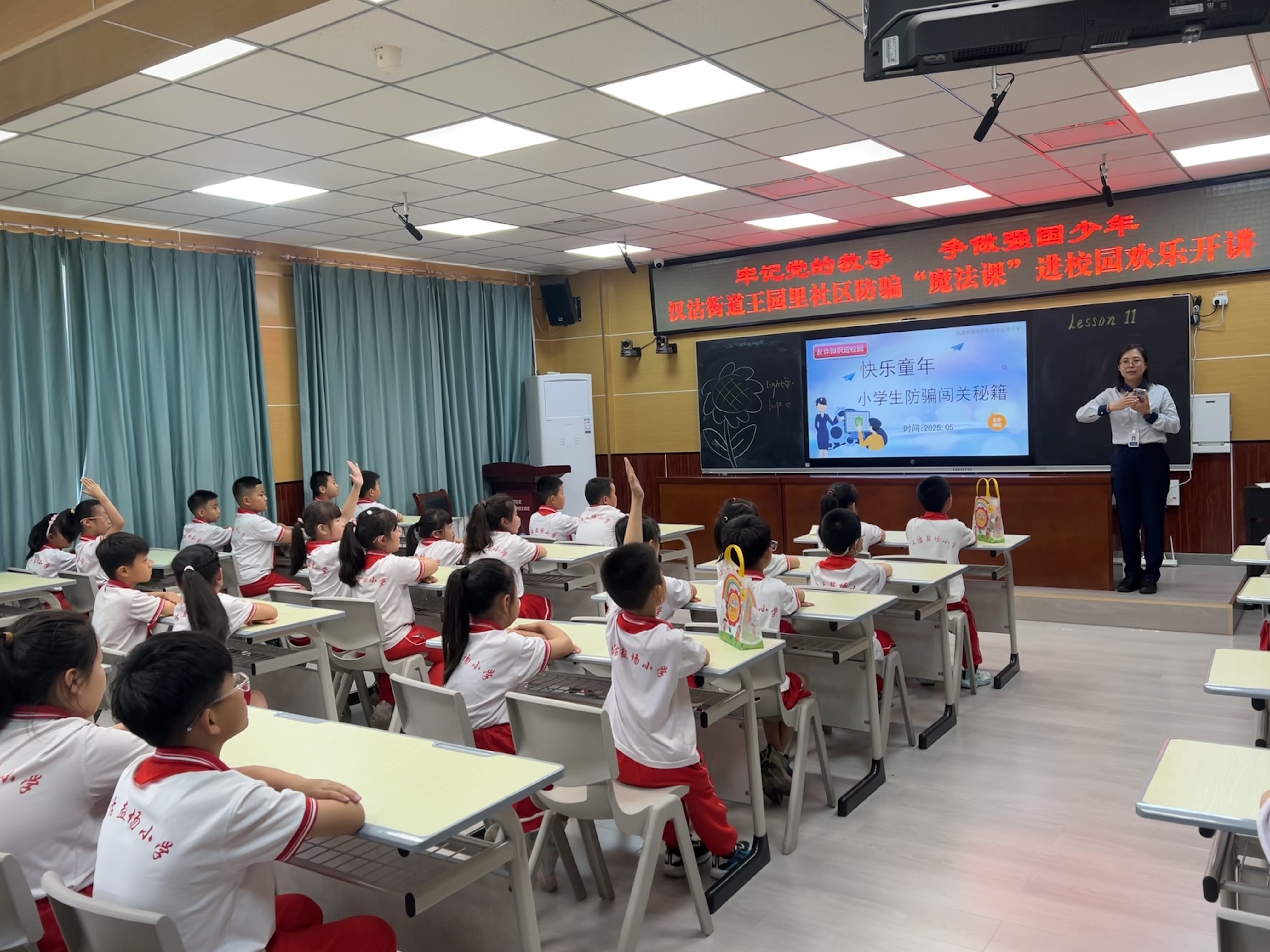 “魔法老师”还设计了丰富的互动环节,邀请同学们上台参与情景模拟。孩子们积极踊跃,通过扮演诈骗分子、受害者等角色,在欢声笑语中深刻理解了诈骗的套路和危害。在问答环节,同学们积极举手,准确回答出防范诈骗的要点,展现出良好的学习效果。