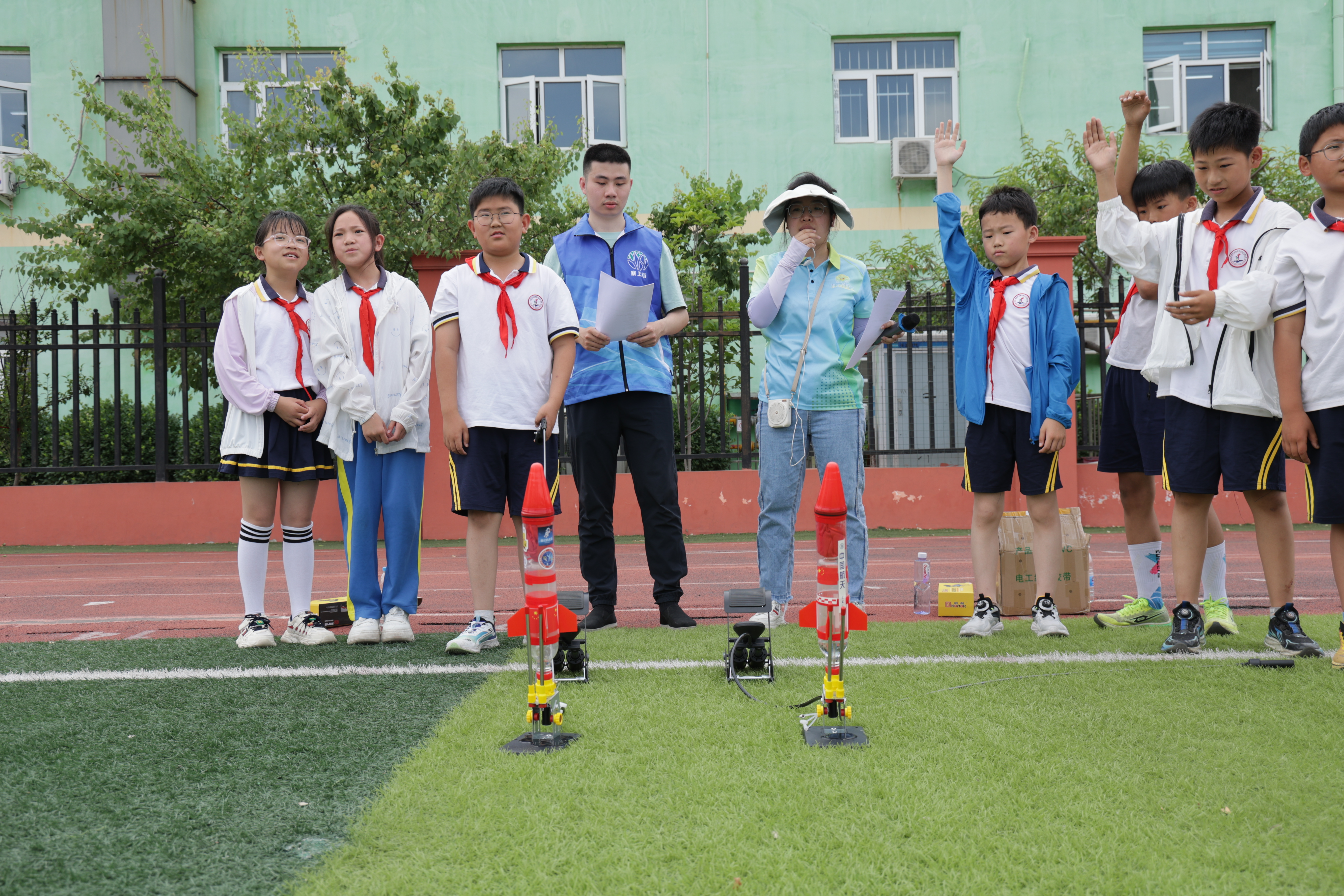 活动核心环节精彩纷呈,充分展现了东海小学学子的科技实践能力与无限创意。苍穹竞速之无人机障碍赛率先点燃全场,无人机在操控员指令下灵活穿越障碍,精准起降,引发阵阵惊叹。一飞冲天环节,水火箭实践区气氛热烈,学生们动手操作、加压发射,目睹自制“火箭”呼啸升空,直观体验反冲原理,欢呼声此起彼伏。