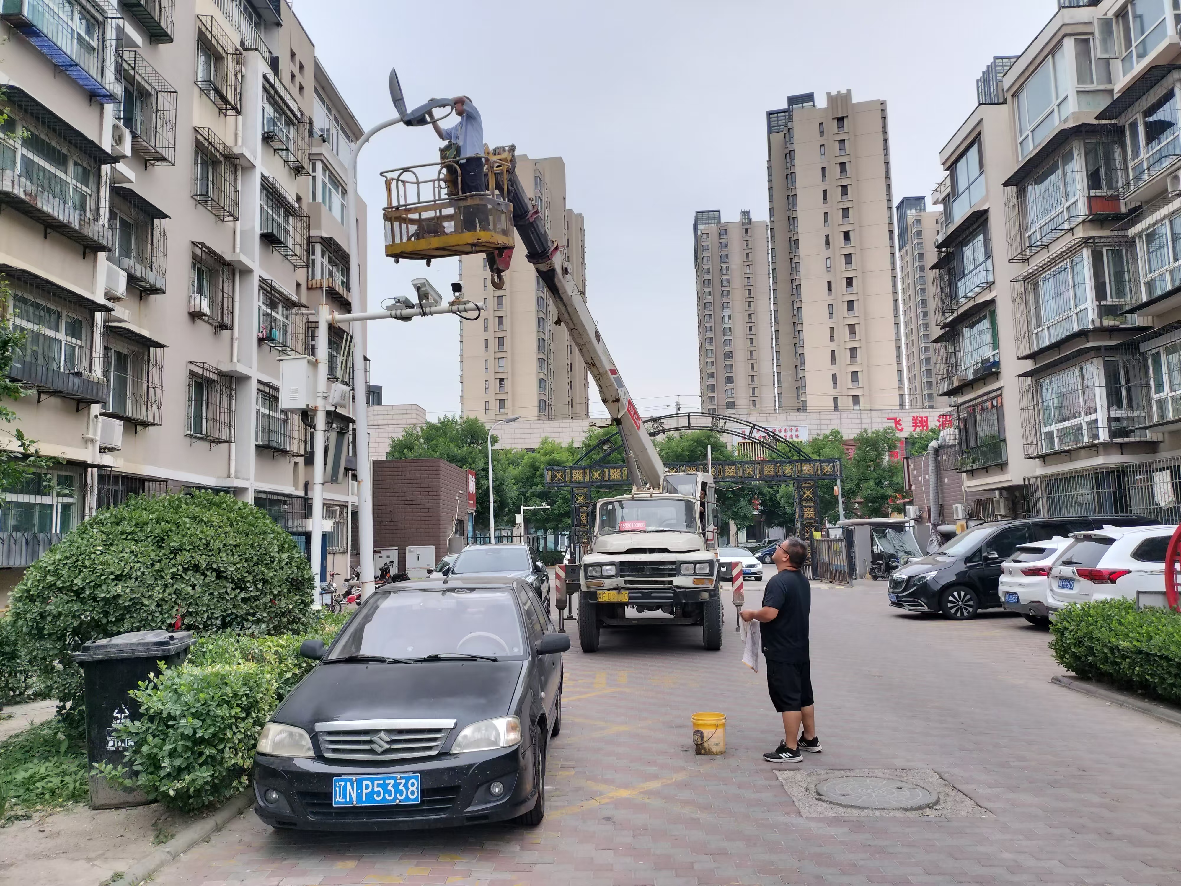 在照明升级行动中,退役老兵与物业人员全面摸排小区院落照明情况,发现多处路灯亮度不足、部分区域光线昏暗。双方迅速制定改造方案,物业公司负责灯具采购与技术支持,“老兵帮帮团”协助施工。从拆卸老旧灯具到安装节能高亮新路灯,从调试线路到检查照明效果,军民协作、默契配合。崭新的路灯不仅照亮了黑夜,更点亮了居民回家的“安心路”。