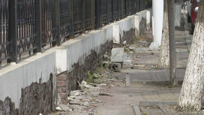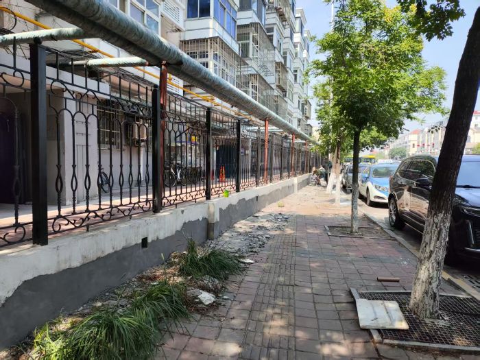 记者来到延安里小区查看情况,小区北侧与便道相连有一段近500米长的院墙。上半部分为铁艺栅栏,靠近地面则是由砖块砌成的围栏。其中,围栏涂料层多处开裂、脱落,内部的红砖也出现了缺损。大量水泥碎块散落一地,给居民出行增添了许多麻烦。