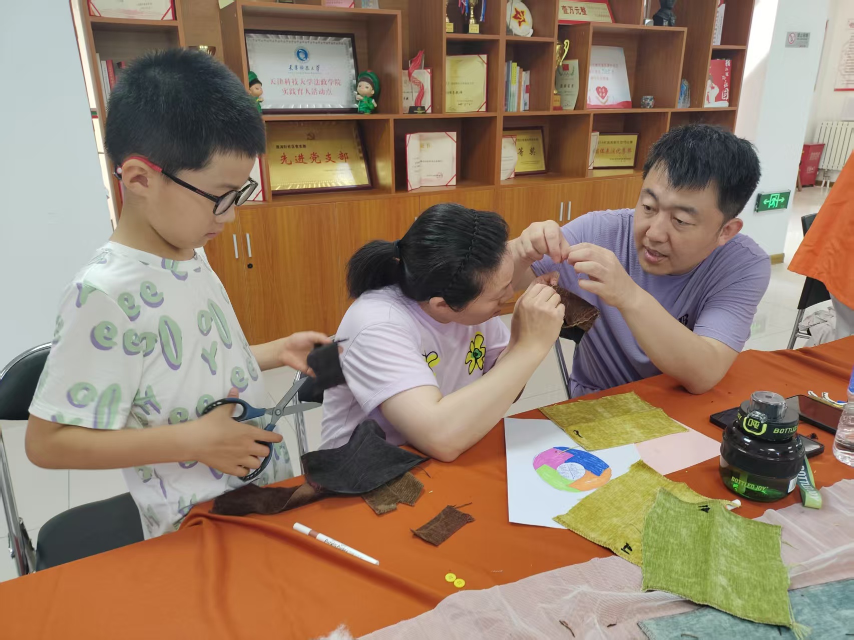 活动开始,亲子手工环节成为创意与情感交融的舞台。孩子们化身小小设计师,在画纸上尽情勾勒天马行空的图案——有憨态可掬的小兔子、绮丽梦幻的七色花,还有创意满满的吸管杯。家长们则手持针线,化身“实现梦想的工匠”,全神贯注地将孩子的设计一针一线缝制成立体玩偶。活动特别强调“尊重原创”原则,家长需完全遵循孩子的设计构思,不随意修改线条、色彩与造型。在穿针引线间,孩子们兴奋地指导家长配色、调整细节,家长们也放下平日的权威姿态,耐心倾听孩子的想法,现场满是欢声笑语与温馨协作。